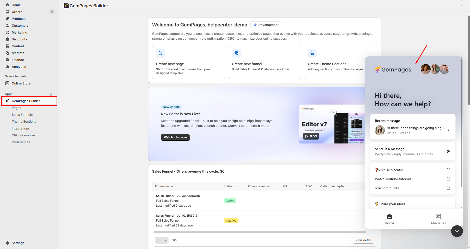 If the live chat icon isn’t visible, you can reach our support team via Messenger on the GemPages Facebook Page or email at support@gempages.help.