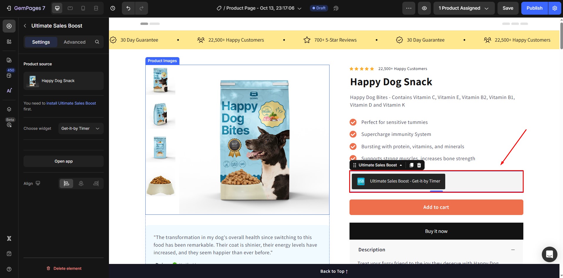 Step 1: From the GemPages Dashboard, select the preferred template and enter the Editor. Locate the Hextom: Ultimate Sales Boost element on the left sidebar. Next, drag & drop the element.