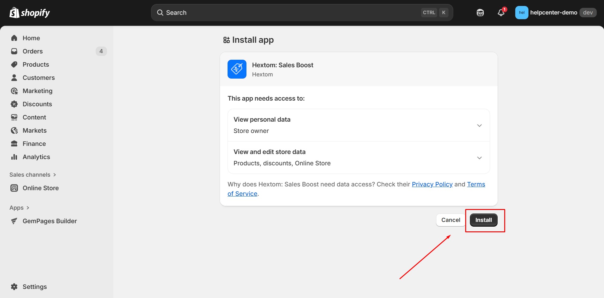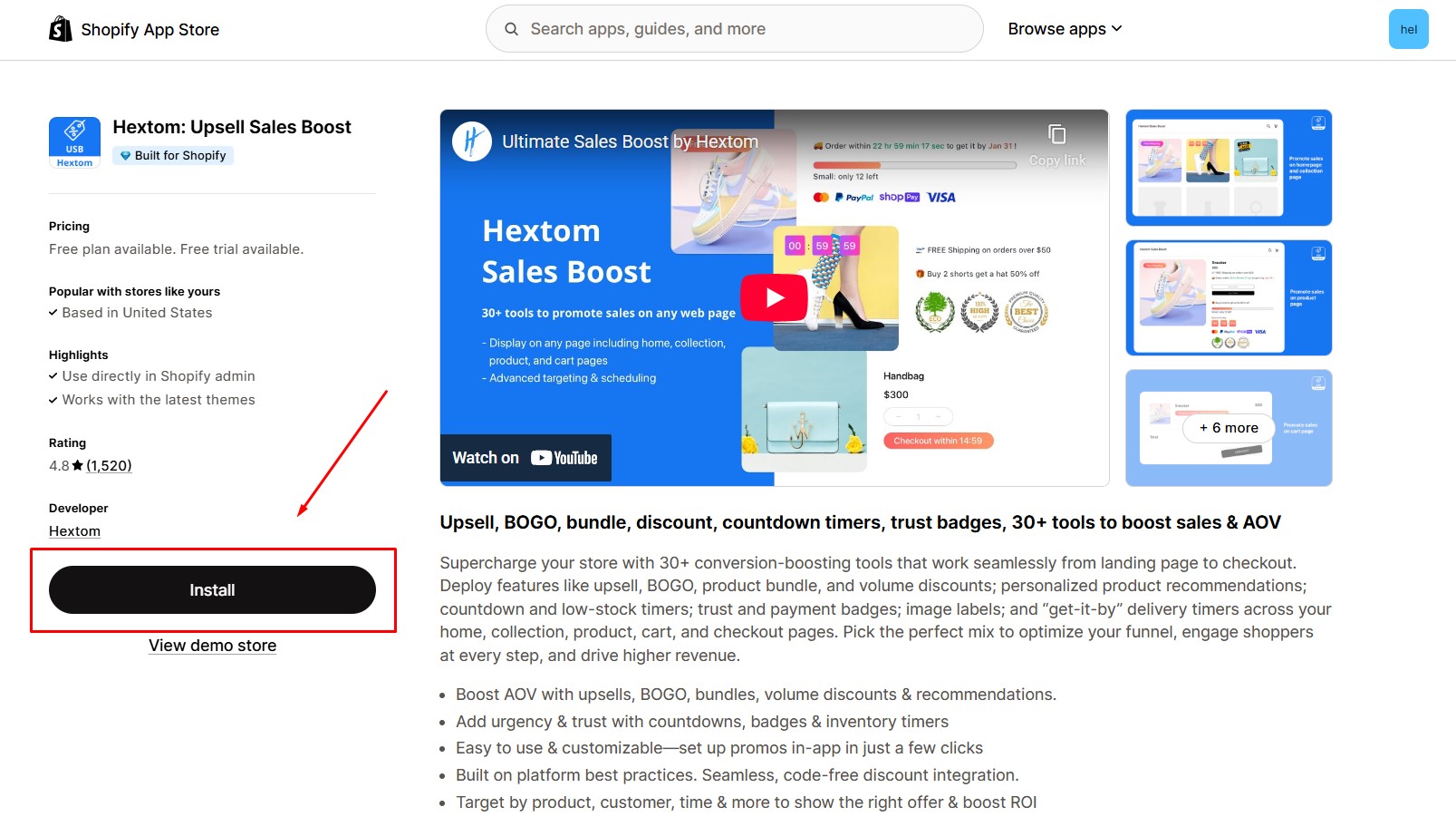 Step 1: Install the Hextom: Ultimate Sales Boost app from the Shopify App store by clicking on the “Install” button and filling in your store domain if needed.
