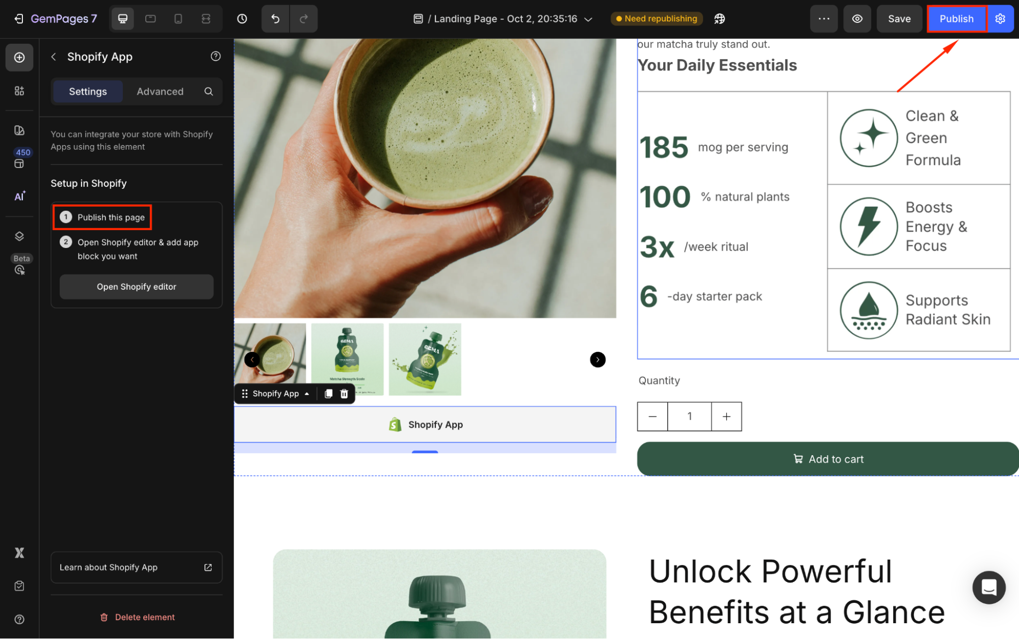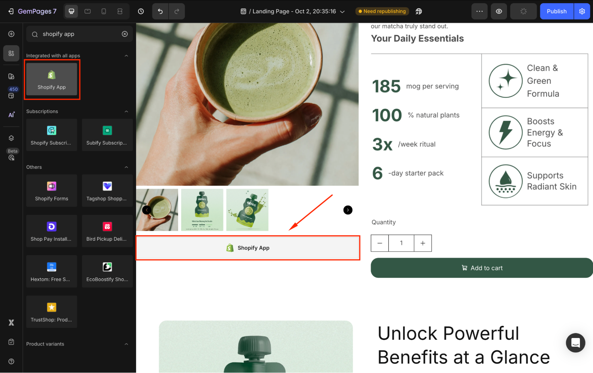 Once the app is ready and embedded, follow these steps to add Trustpilot content blocks to your GemPages pages.
