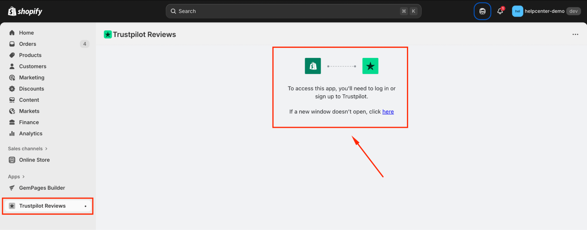 Step 3: You’ll be redirected to the app dashboard. If not, click “here” to log in or sign up to Trustpilot first.