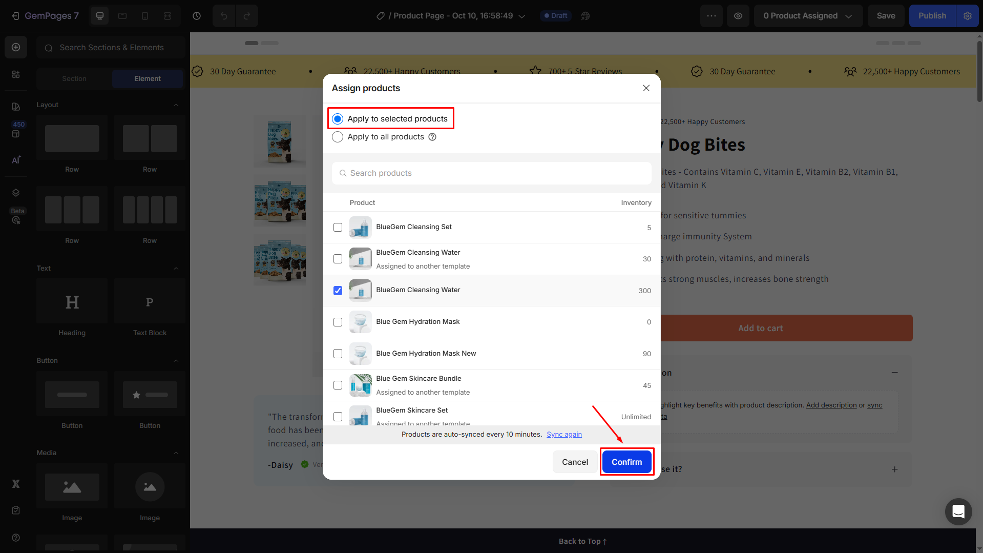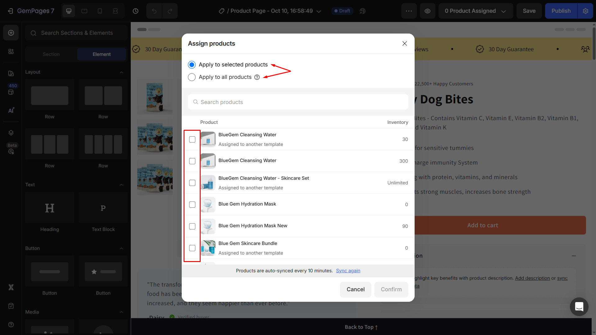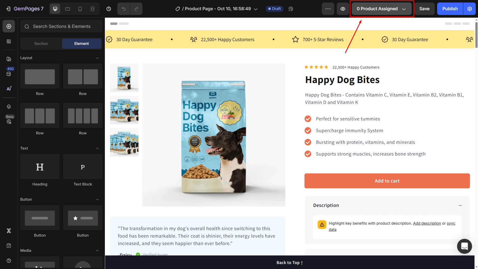 Step 2: On the top bar in the GemPages Editor, you’ll see the 0 Product Assigned button.