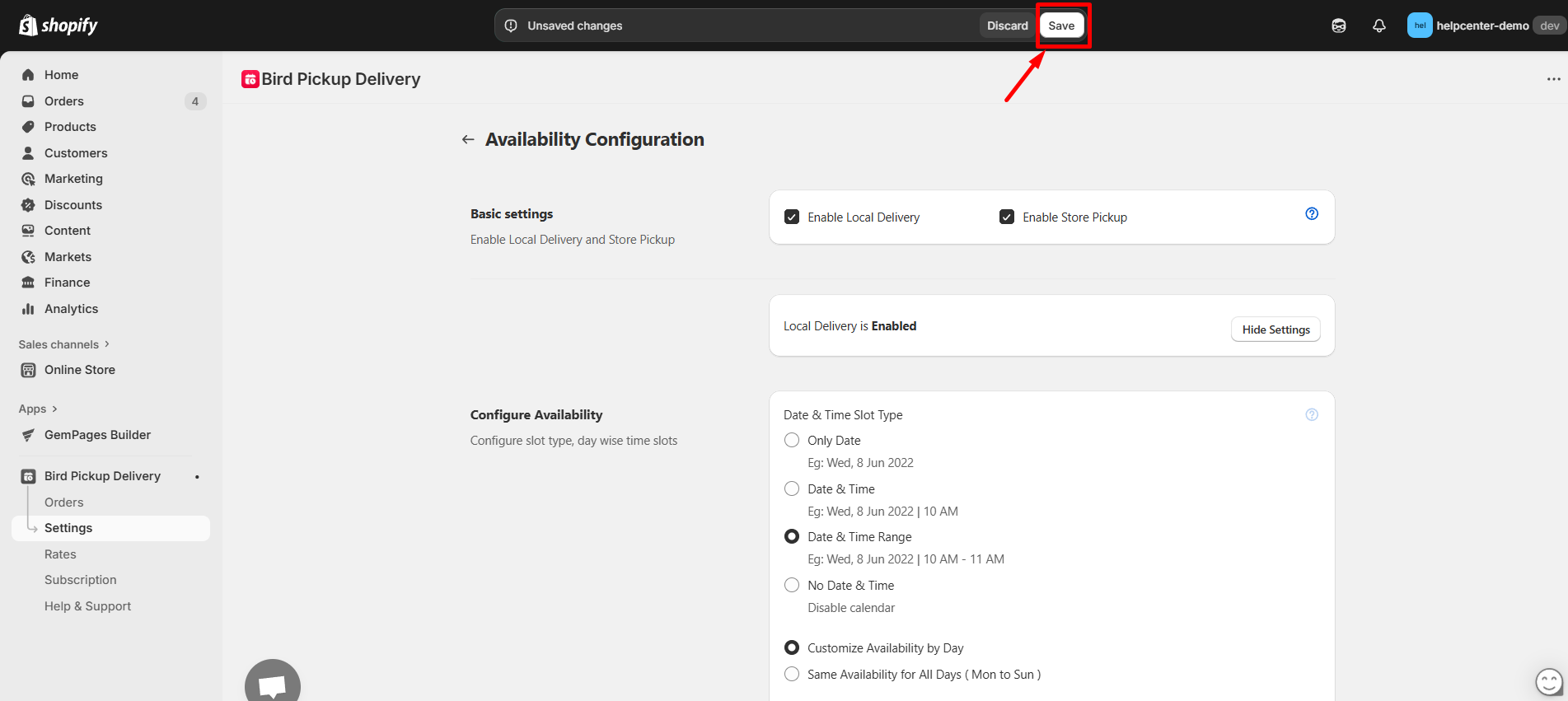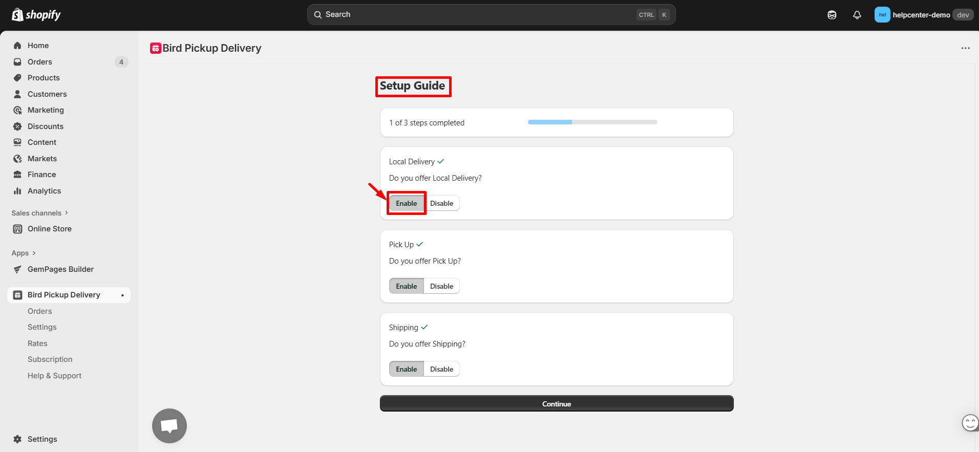 Step 3: After you install the app successfully, you will be redirected to the setup page immediately. Enable all the delivery options you want to set up for your store.