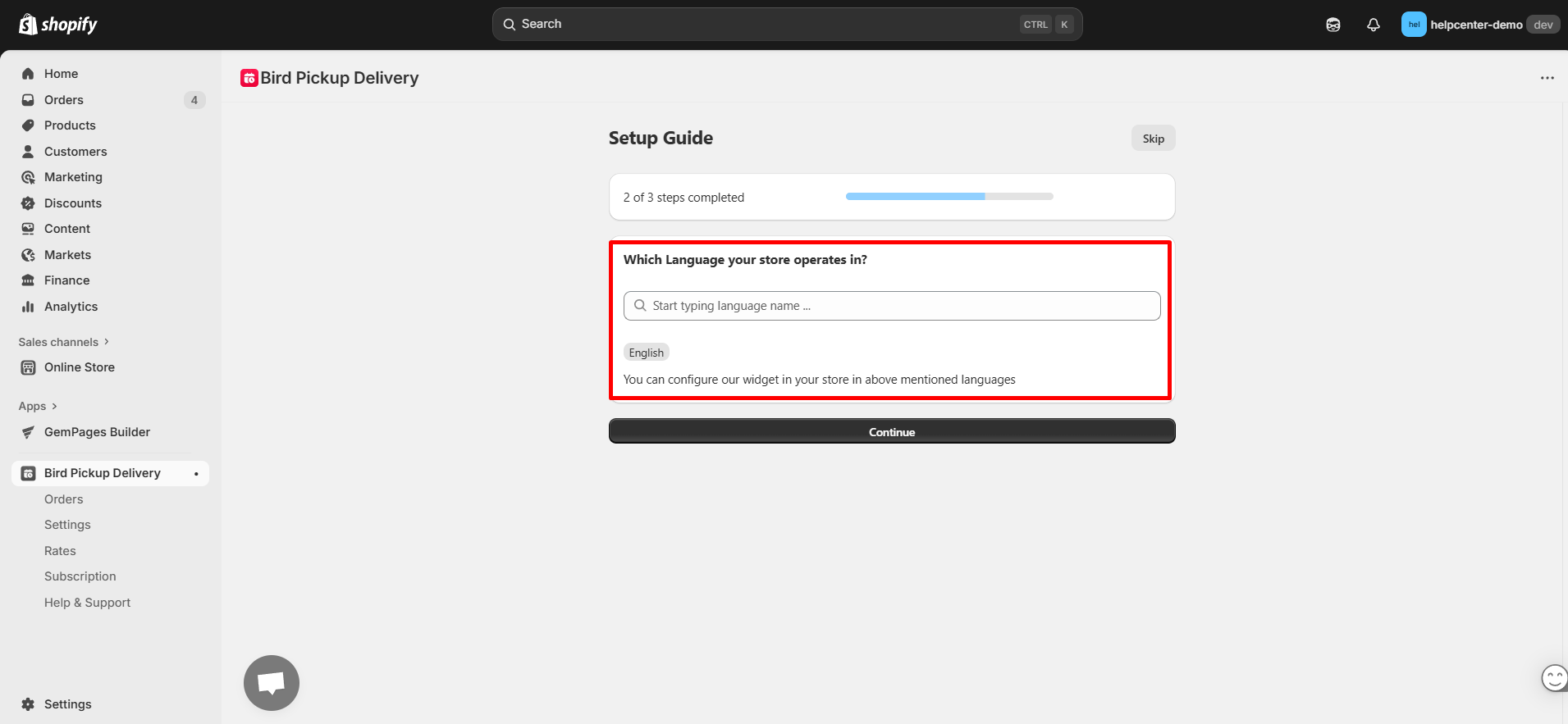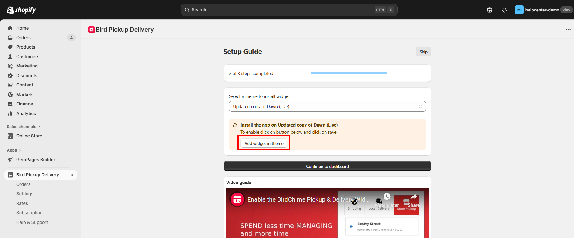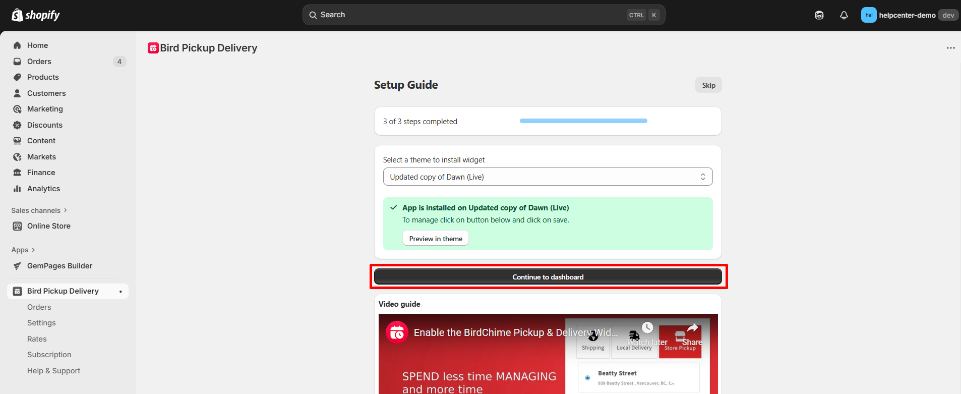 Step 6: Select “Continue to dashboard” to finish setting up the Bird Pickup Delivery Date app on your theme.
