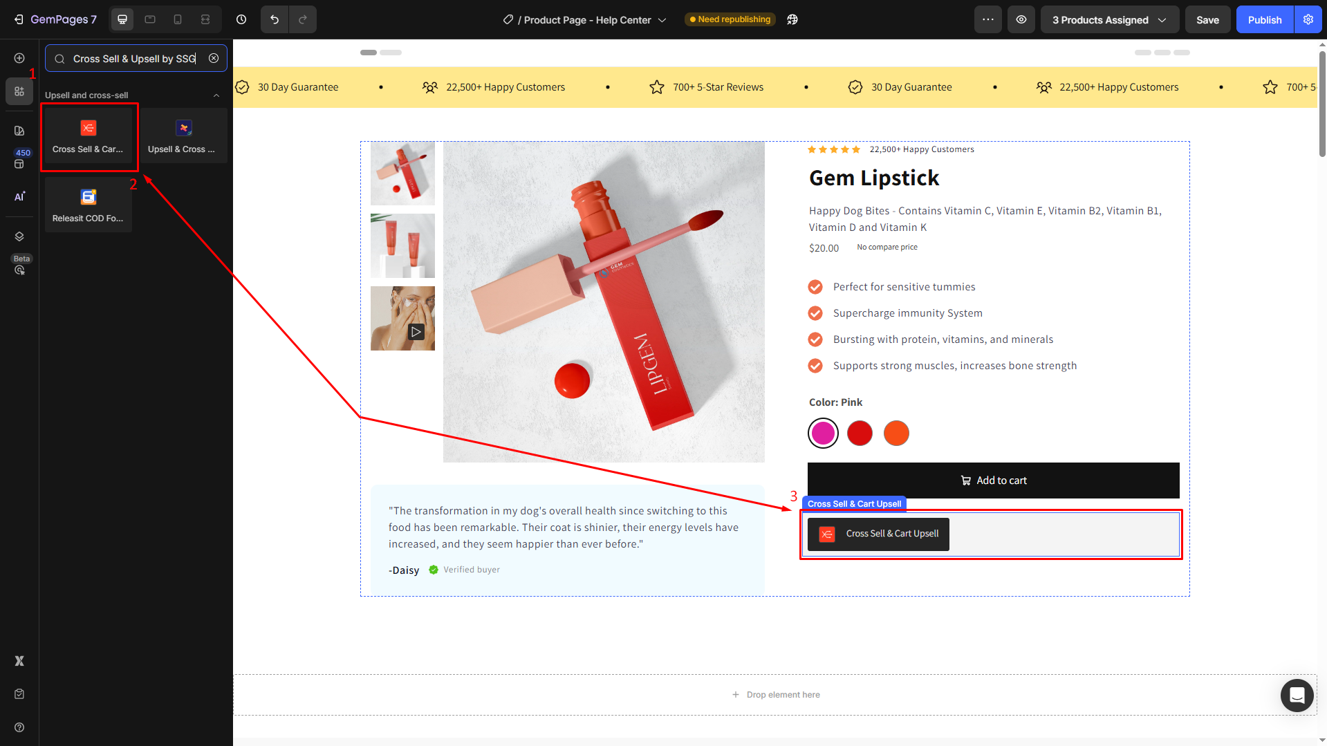 Step 2: From the left sidebar, go to Shopify Apps, enter “Cross Sell & Upsell by SSG” in the search bar, then drag and drop the app element to your desired position.