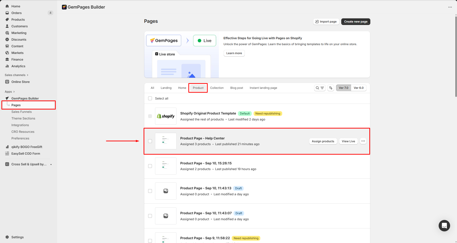 Step 1: Navigate to Apps > GemPages Builder > Pages, and select the Product tab to access all your product pages built with GemPages.