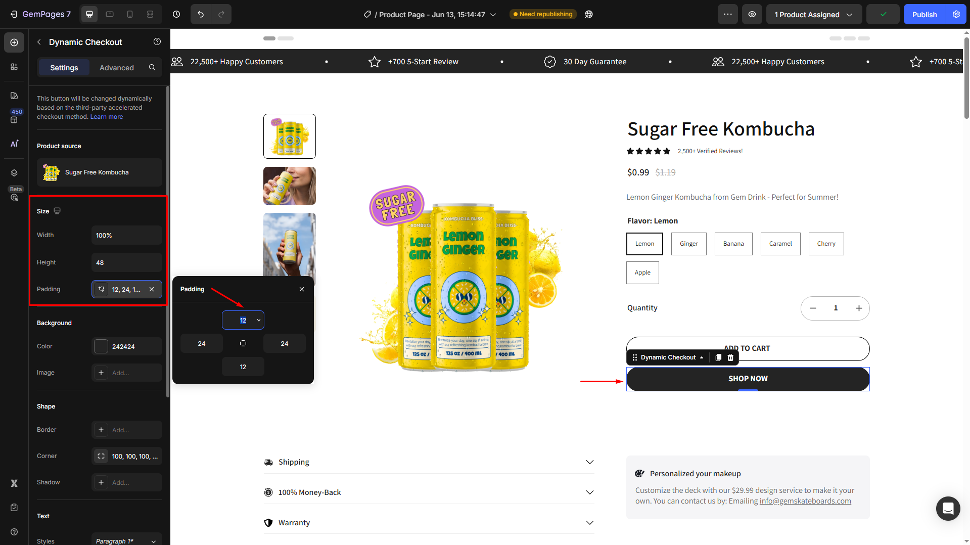 Under the Size section, adjust the width, height, and padding of the button:
