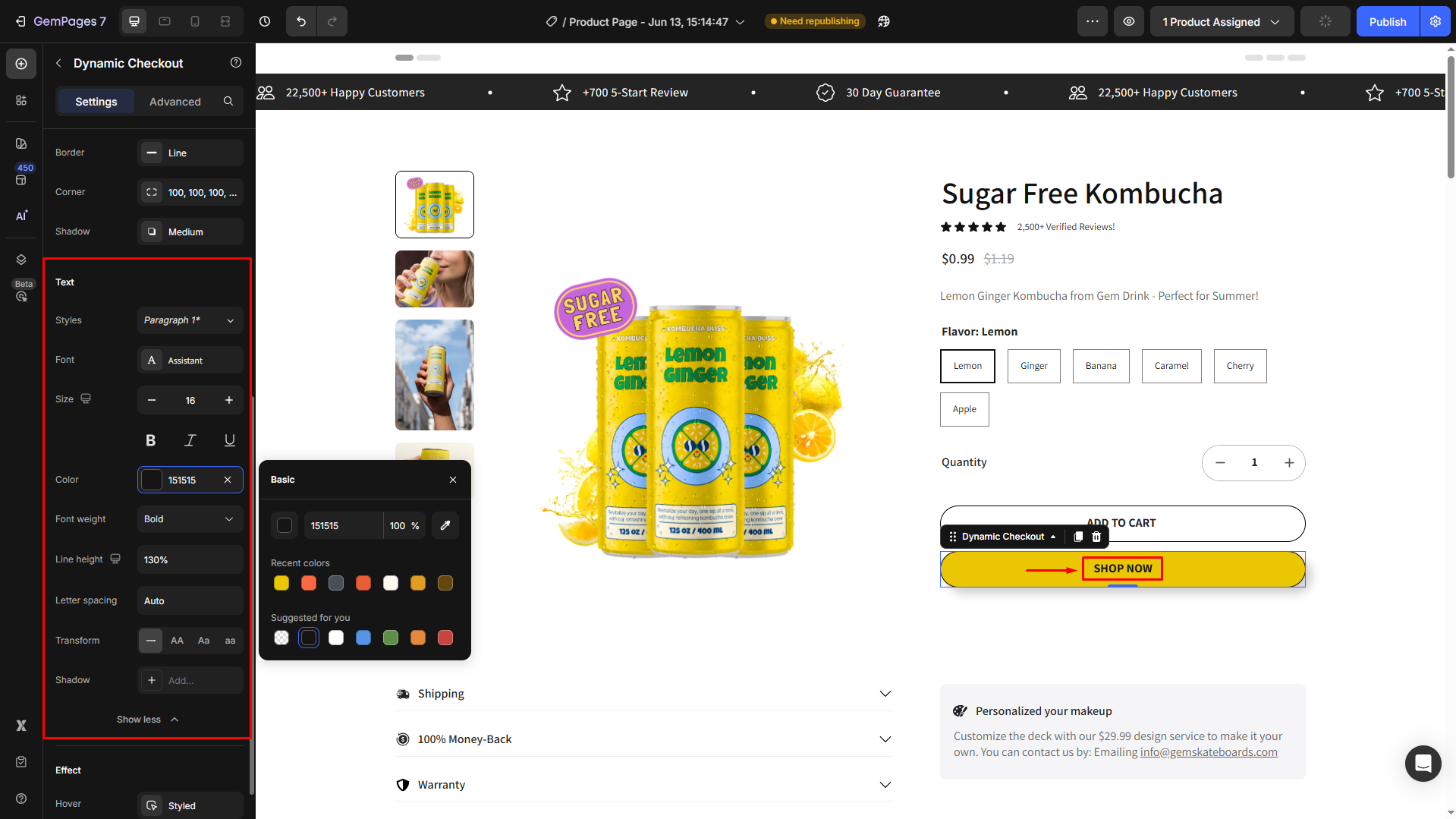 - Color: Open the settings panel to select the preferred color for your button. You can use a solid color background or a gradient one.