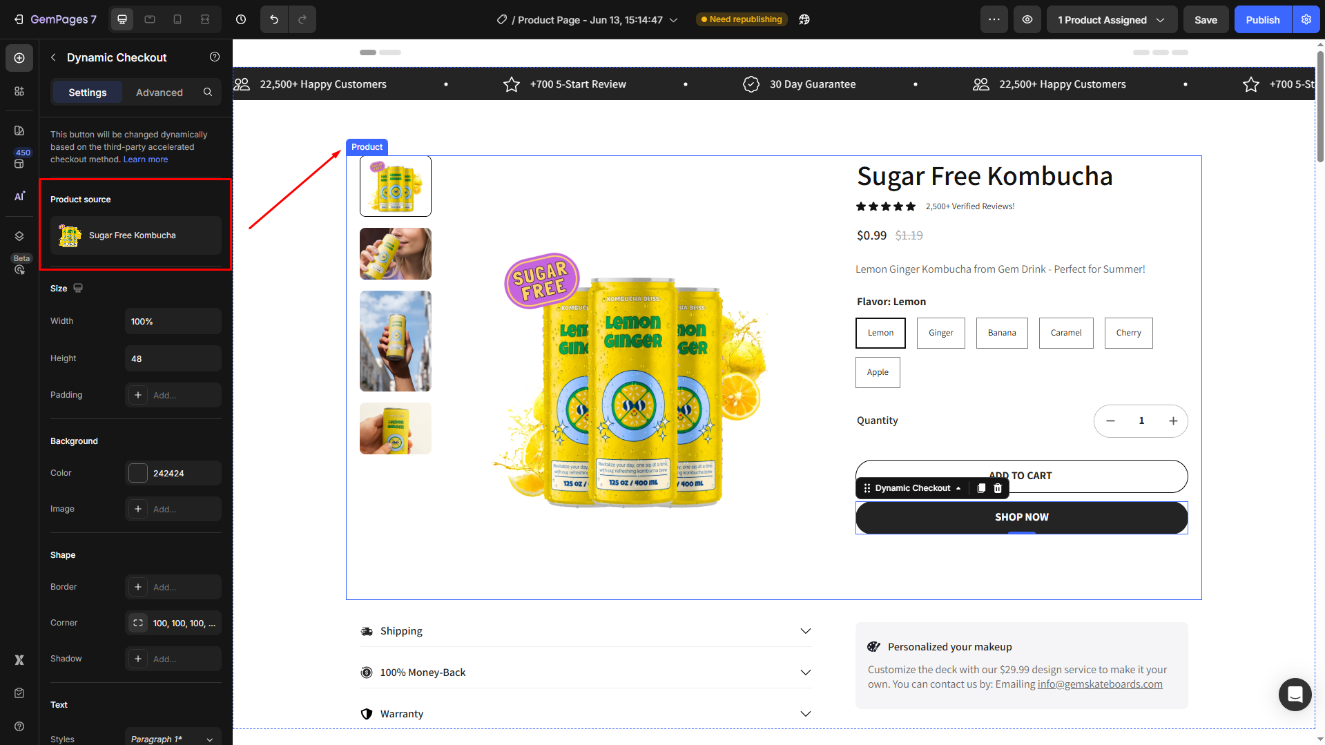 However, if you prefer another product, click on the current product to manage it in the Product element.
