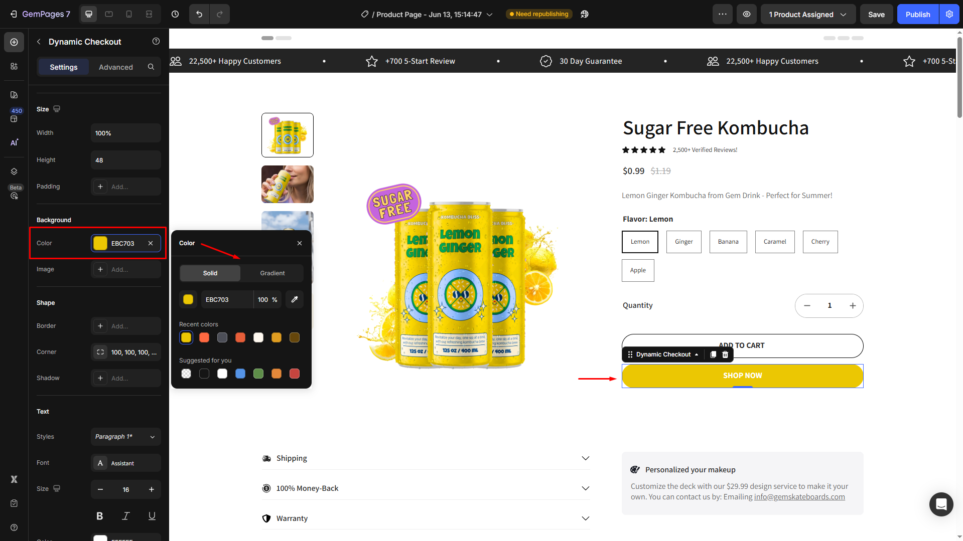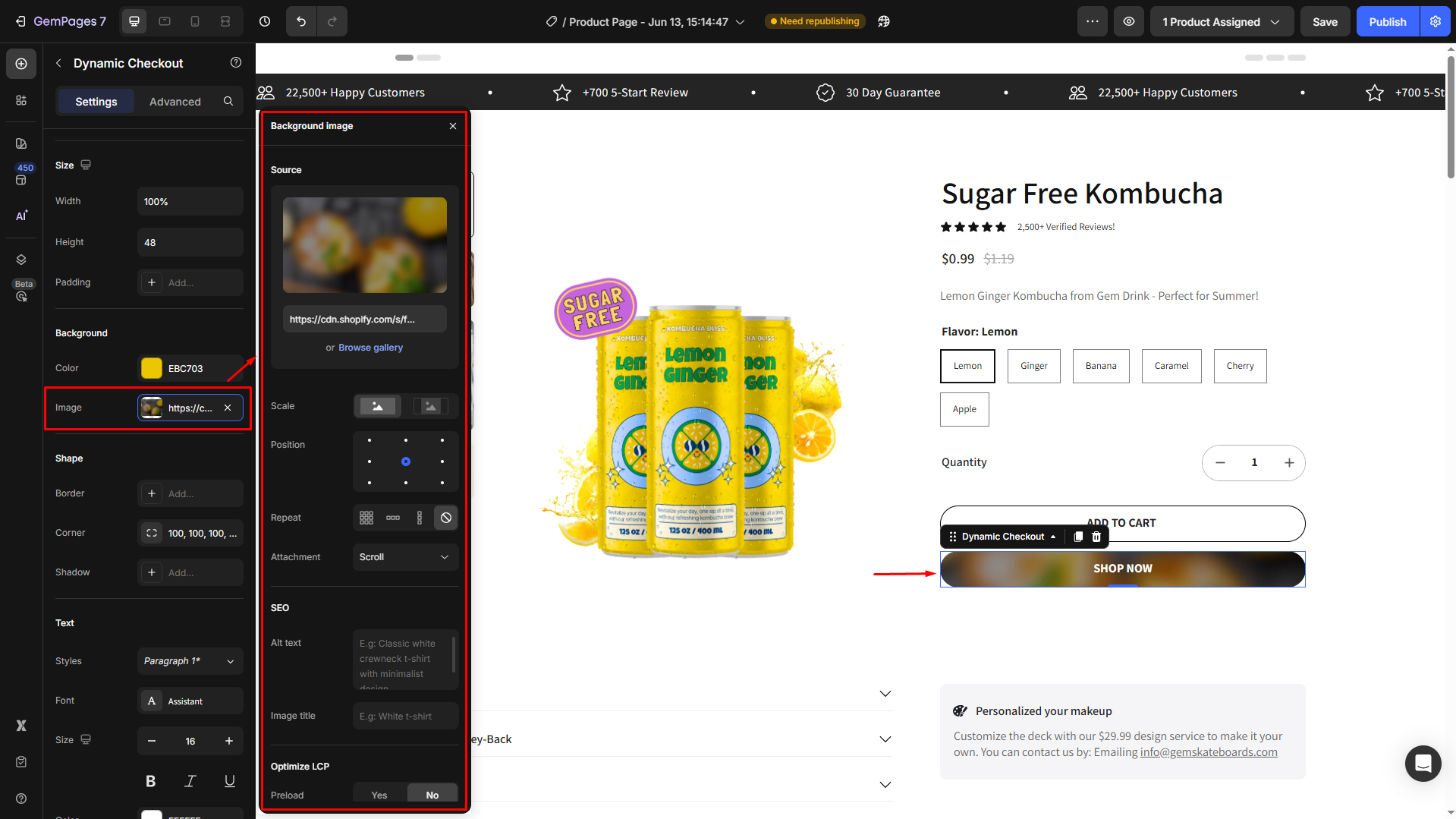 GemPages allows you to set the button’s background by choosing a color or using an image: