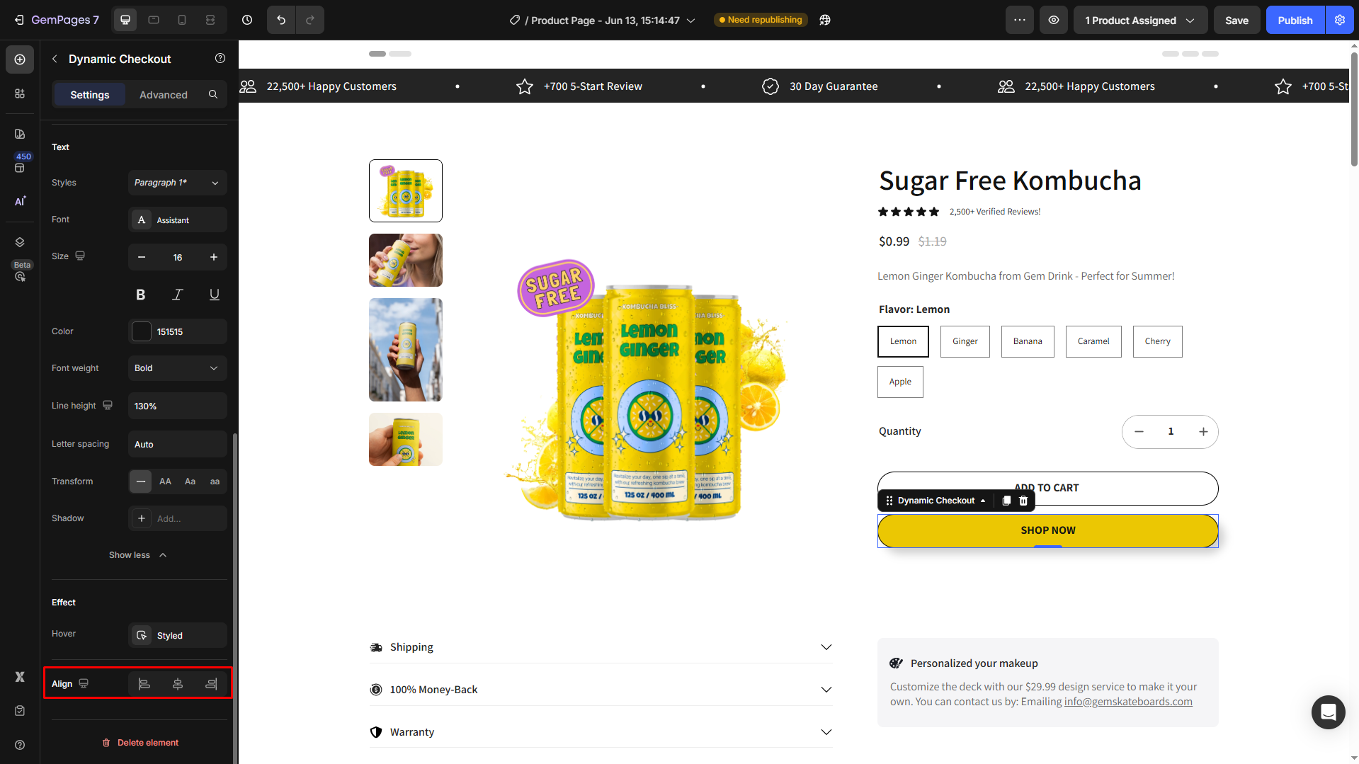 If your button’s width is under 100%, you can change the button alignment: left-aligned, center-aligned, or right-aligned.