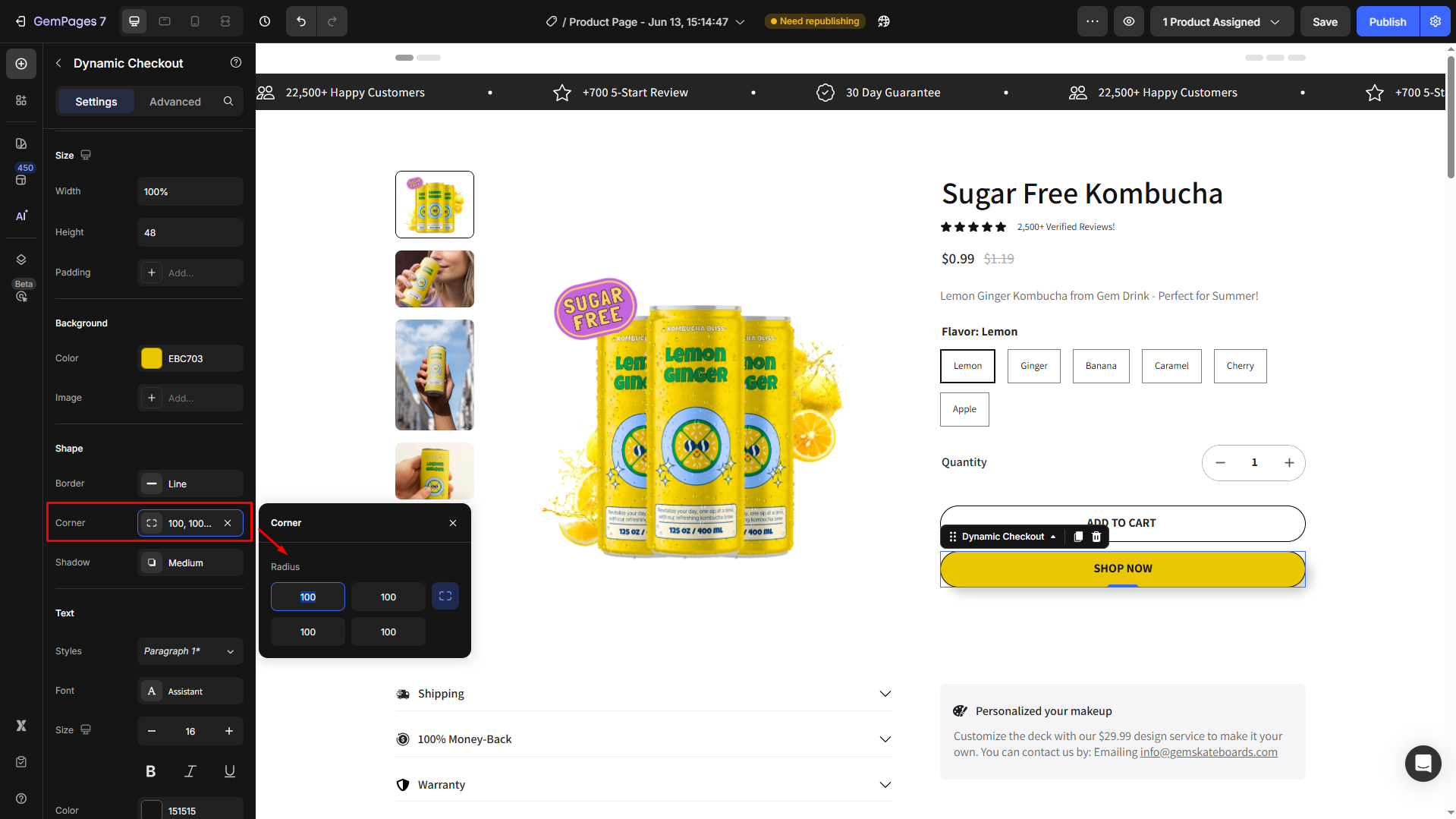 To improve the button’s look, you can add a shape, adjust the corner radius, and add a shadow effect in the Shape section:
