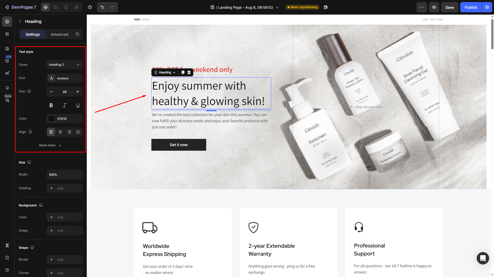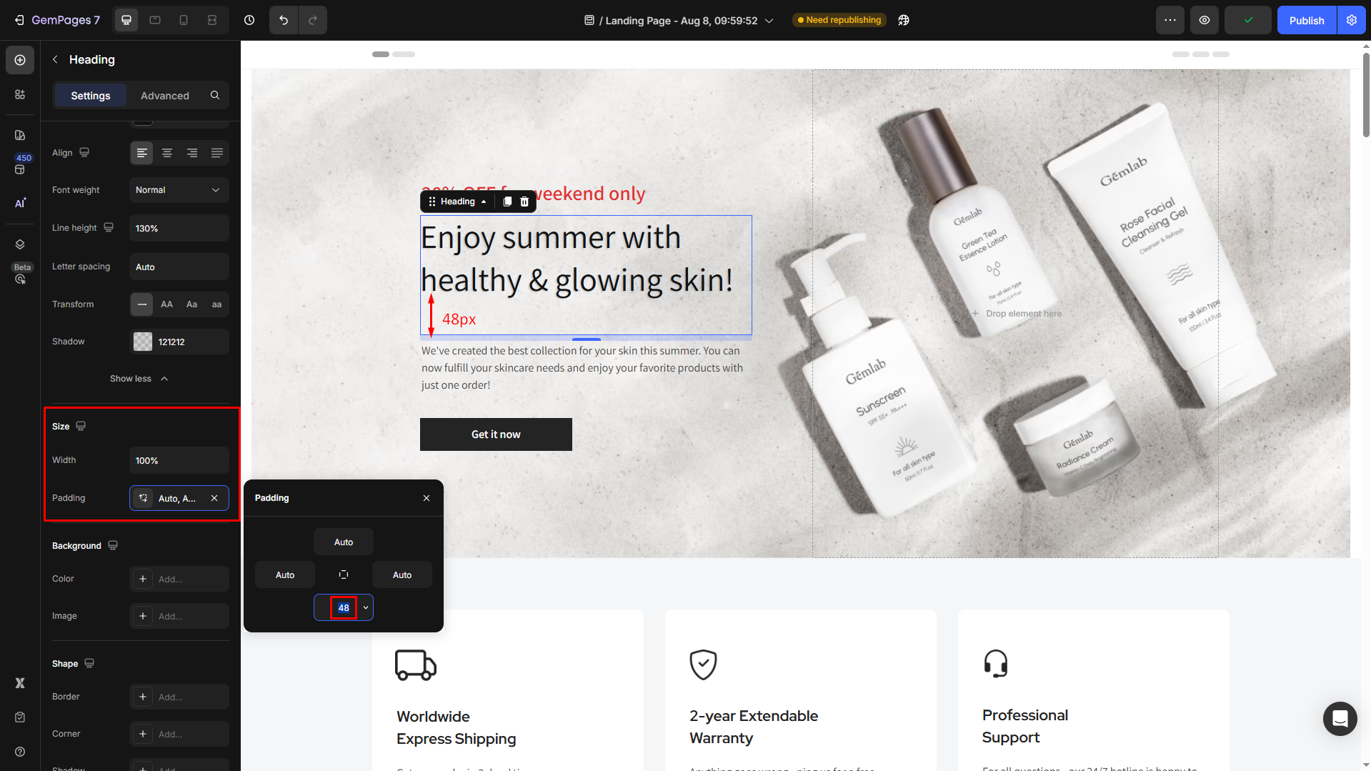 Under the Size section, you can configure the width and padding for your heading to suit the page layout.