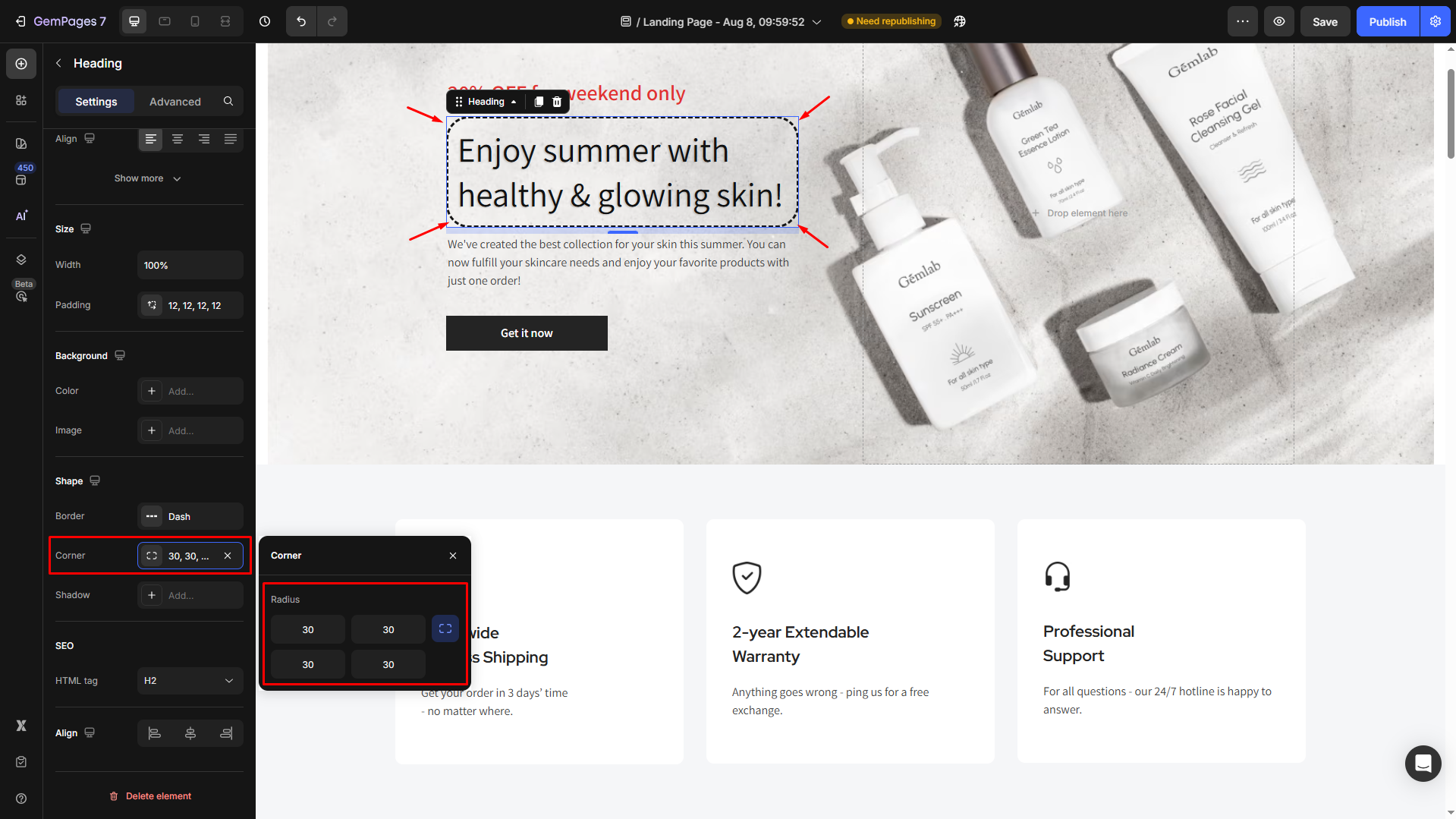 - Corner: Adjust the border-radius to control how rounded the corners of the heading container appear.