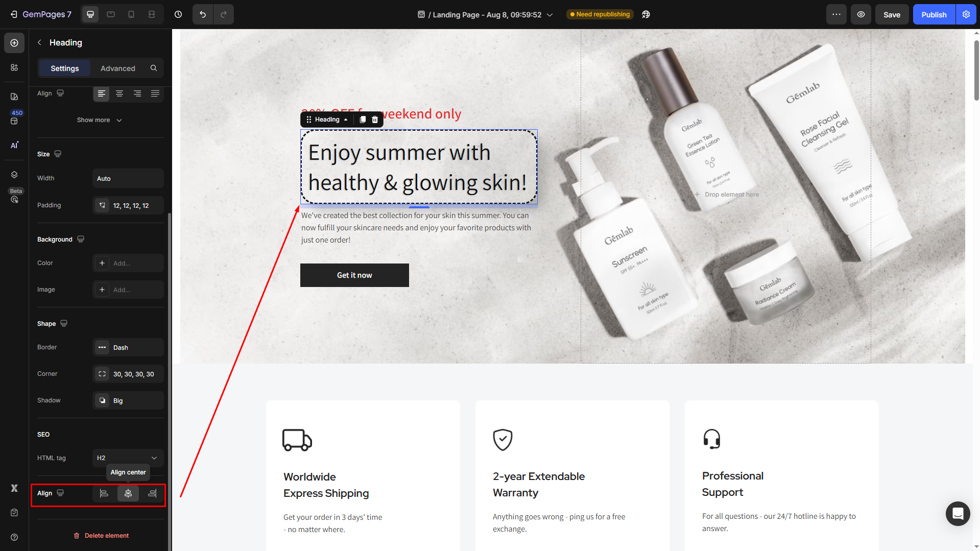 Adjust the heading’s alignment for better readability. You can choose from left-aligned, center-aligned, or right-aligned.