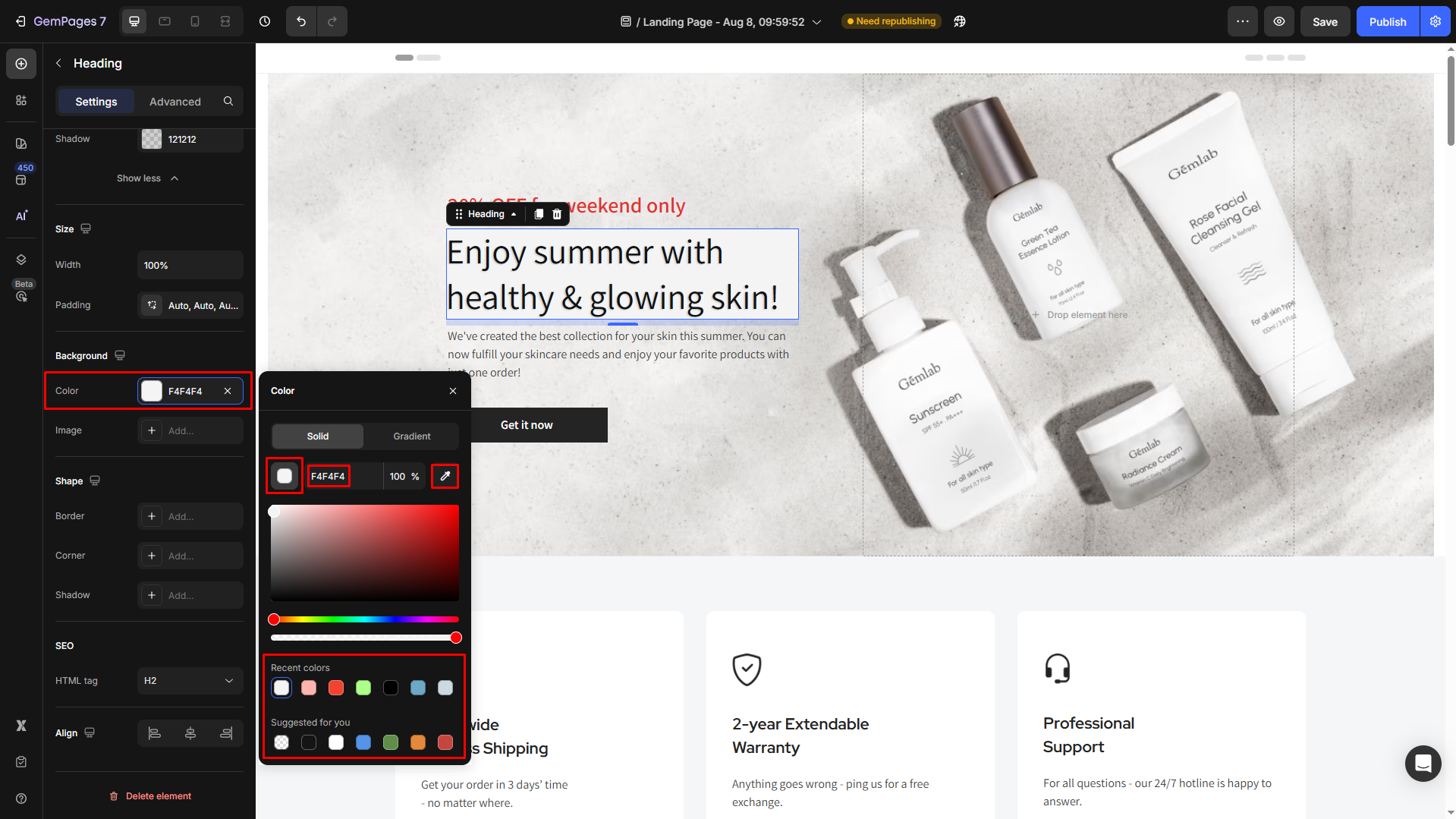 - Color: Enter a color code, choose from the color swatch, or use the color picker. You can also select a preferred color from the Recent colors and Suggested for you lists.