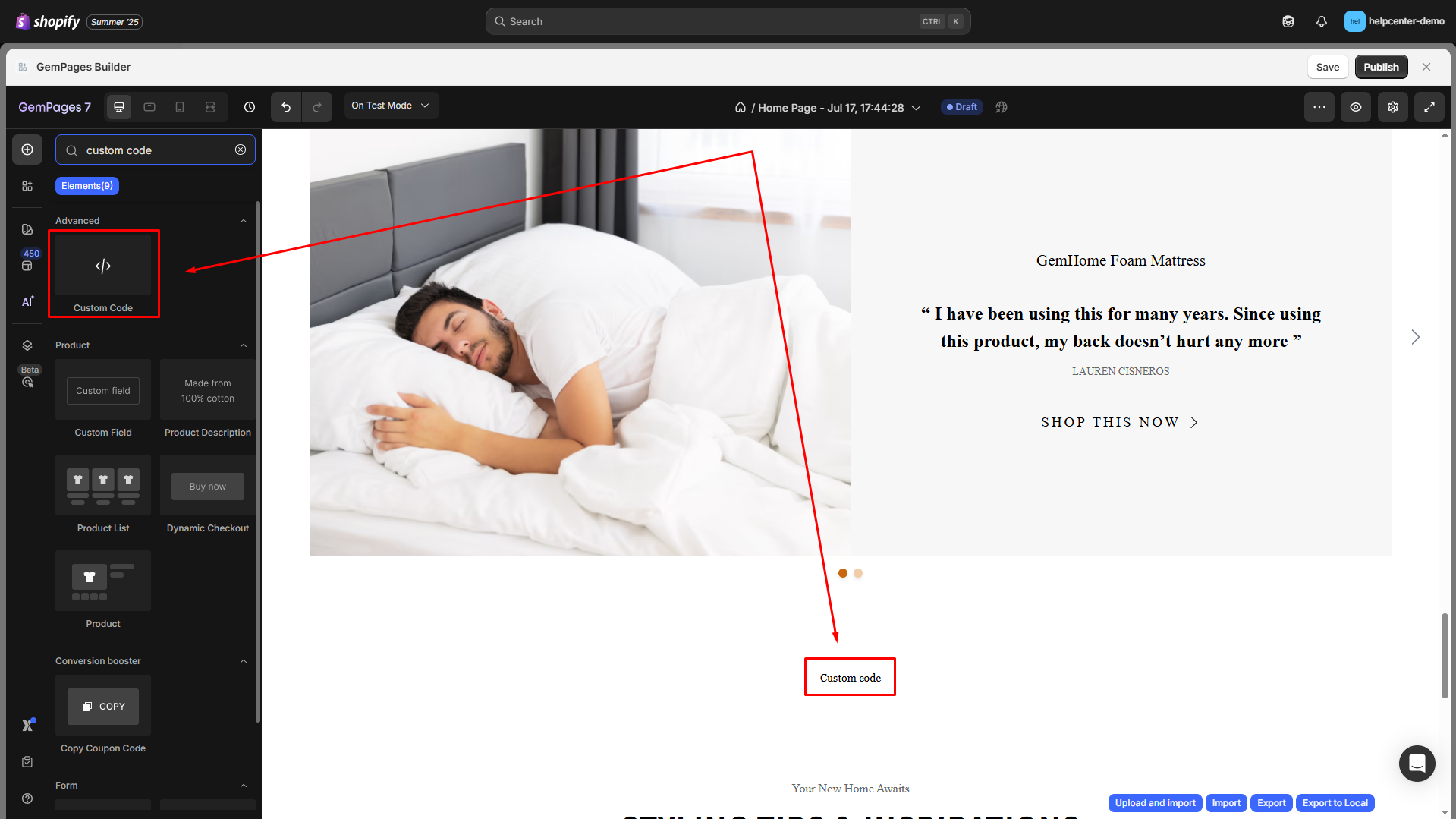 Step 3: From the left sidebar, drag & drop a Custom Code element onto your preferred spot on the page.