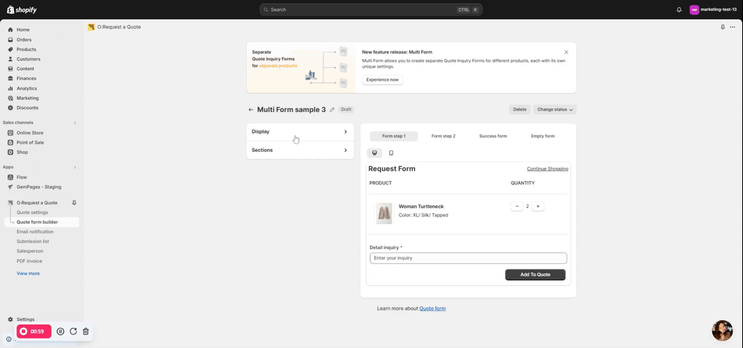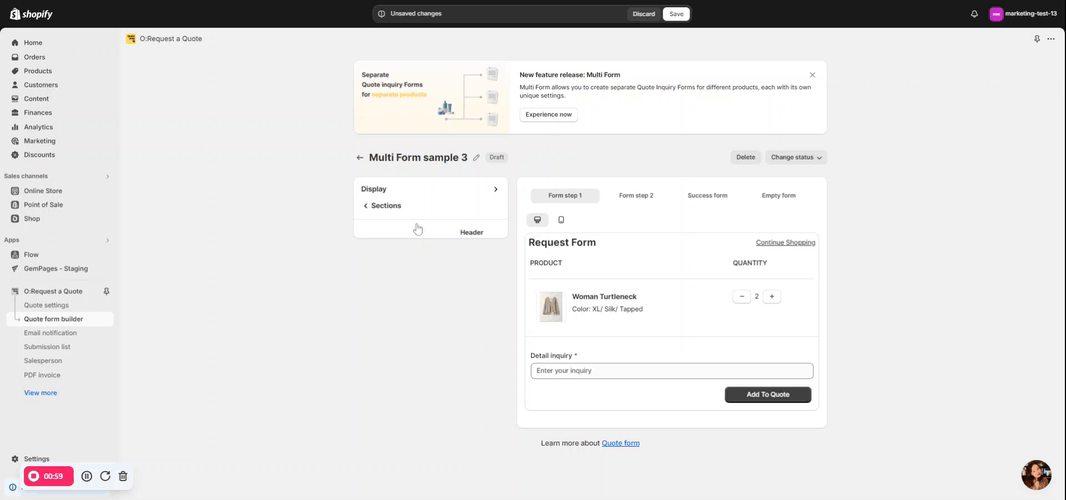 Step 1: Open the O:Request a Quote – Hide Price app and access Quote settings to customize your own quote on product or collection pages.