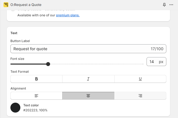 - Text: You can adjust the text, font size, text format, and alignment for your “Add To Quote” button.