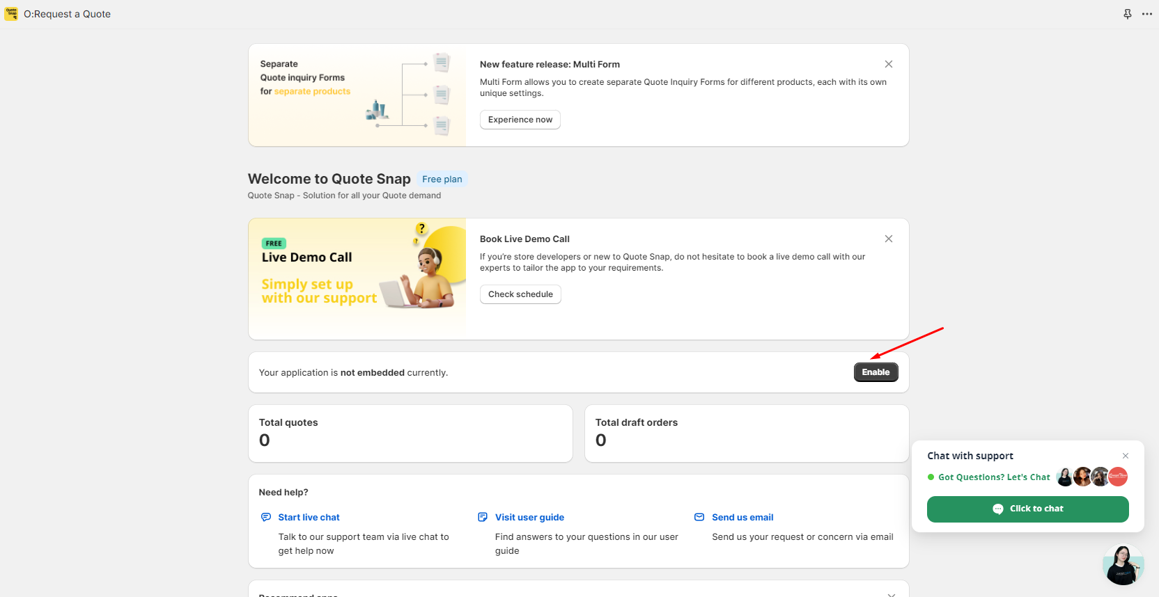 Step 3: Click “Enable” to embed the O:Request a Quote ‑ Hide Price app.