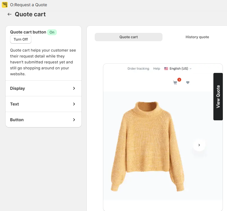 Access Edit setting and customize the sticky quote cart button’s display, text, and button elements. However, this feature is only for premium plans.