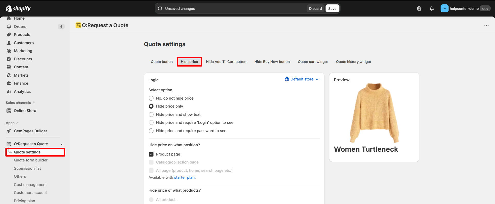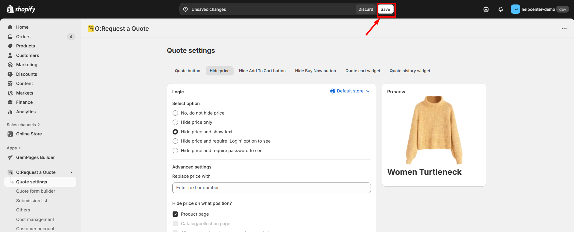 Step 1: Open the Q:Request A Quote & Hide Price app. Get started by clicking on the Quote settings tab, then choose Hide price.