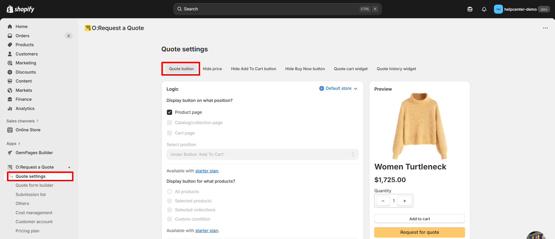 Step 1: Open the Q:Request A Quote & Hide Price app. Get started by clicking on the Quote settings tab, then choose the Quote button.