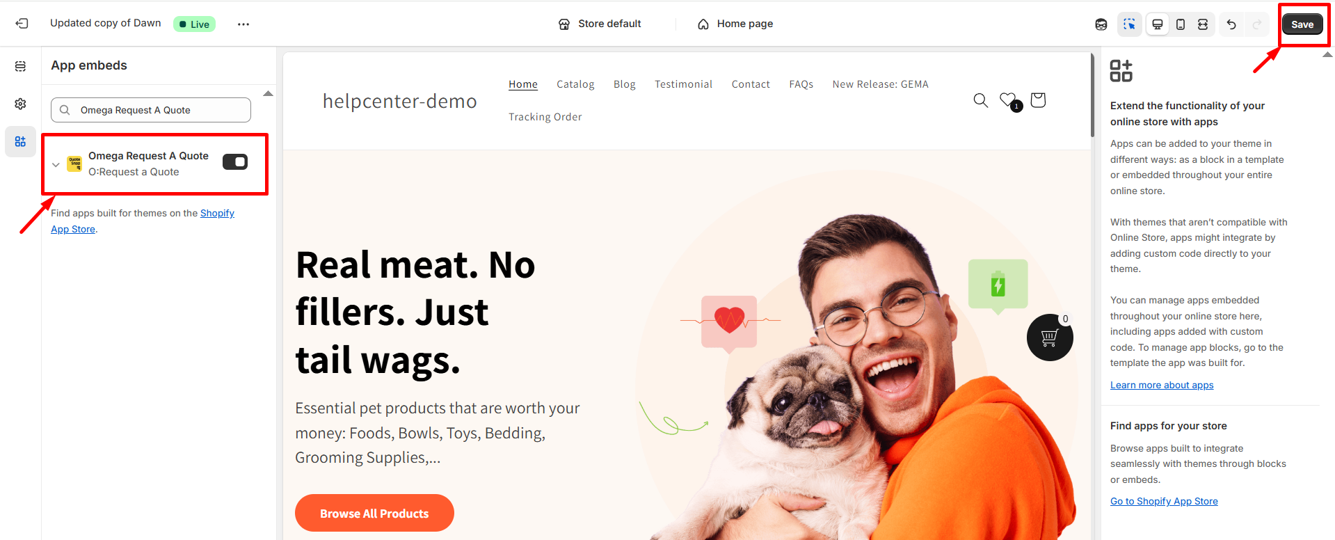 - In the left panel, toggle the button ON, then click “Save” to enable the app.