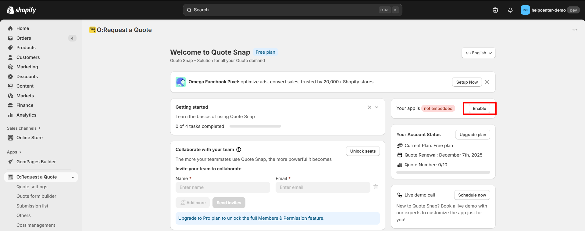 - Return to the app dashboard and click “Enable app embed” to be redirected to your current theme’s editor.