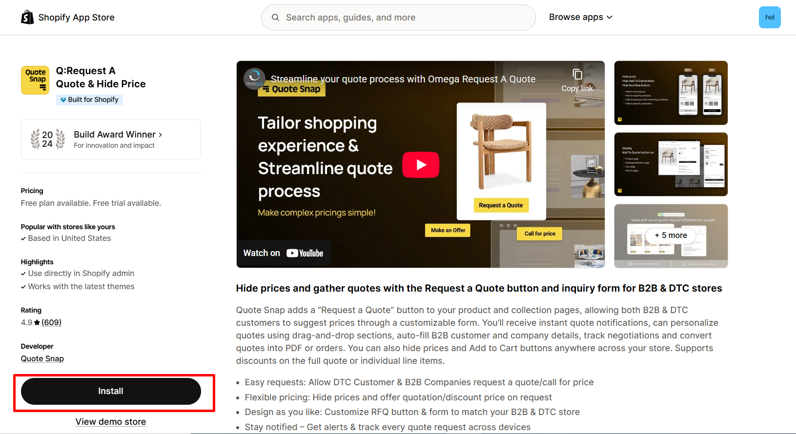 Step 1: Install Q:Request A Quote & Hide Price in the Shopify App Store.