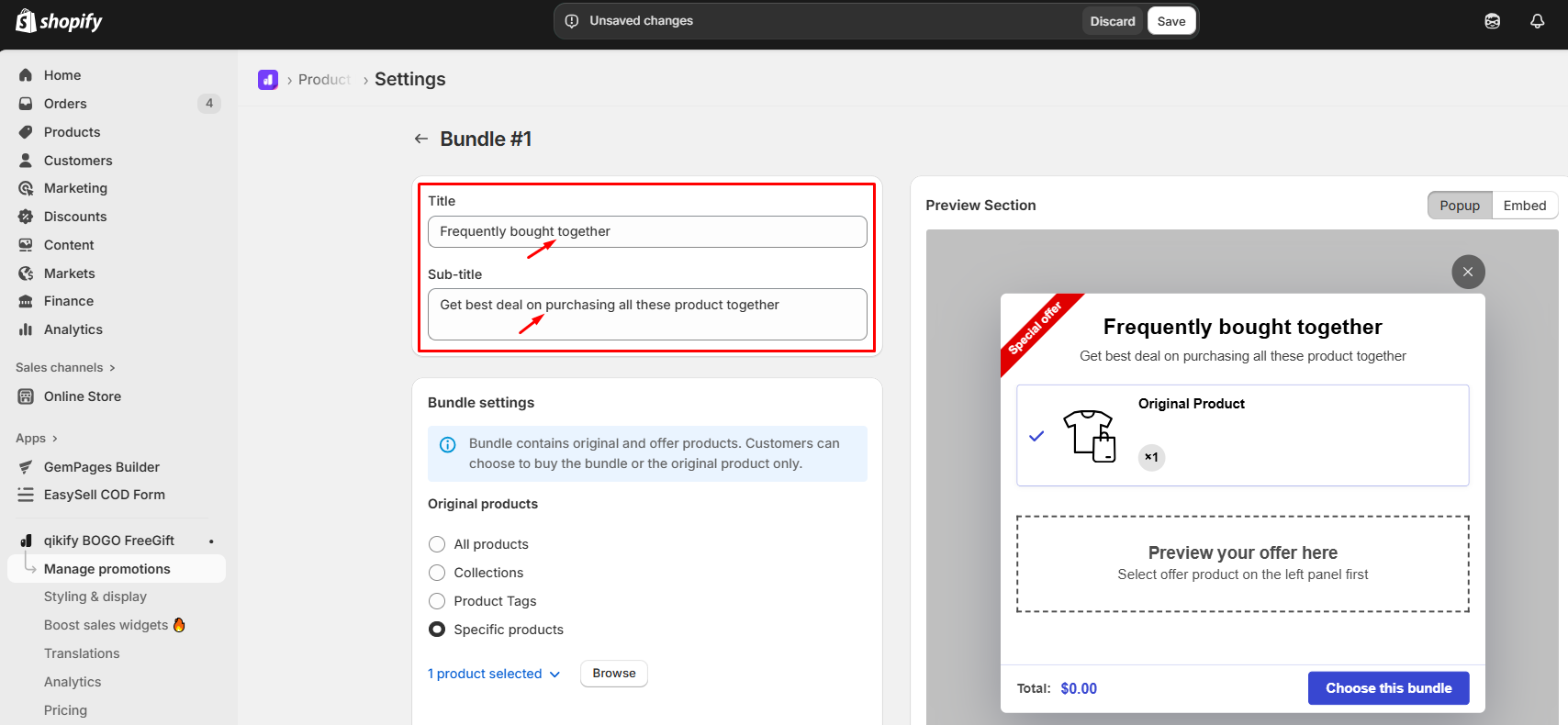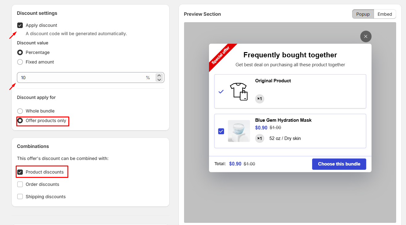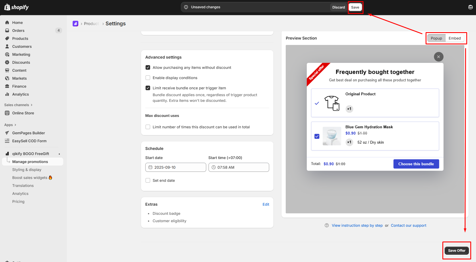 Step 4: Select the type to display the bundle (Embedded or Popup) and save the offer.