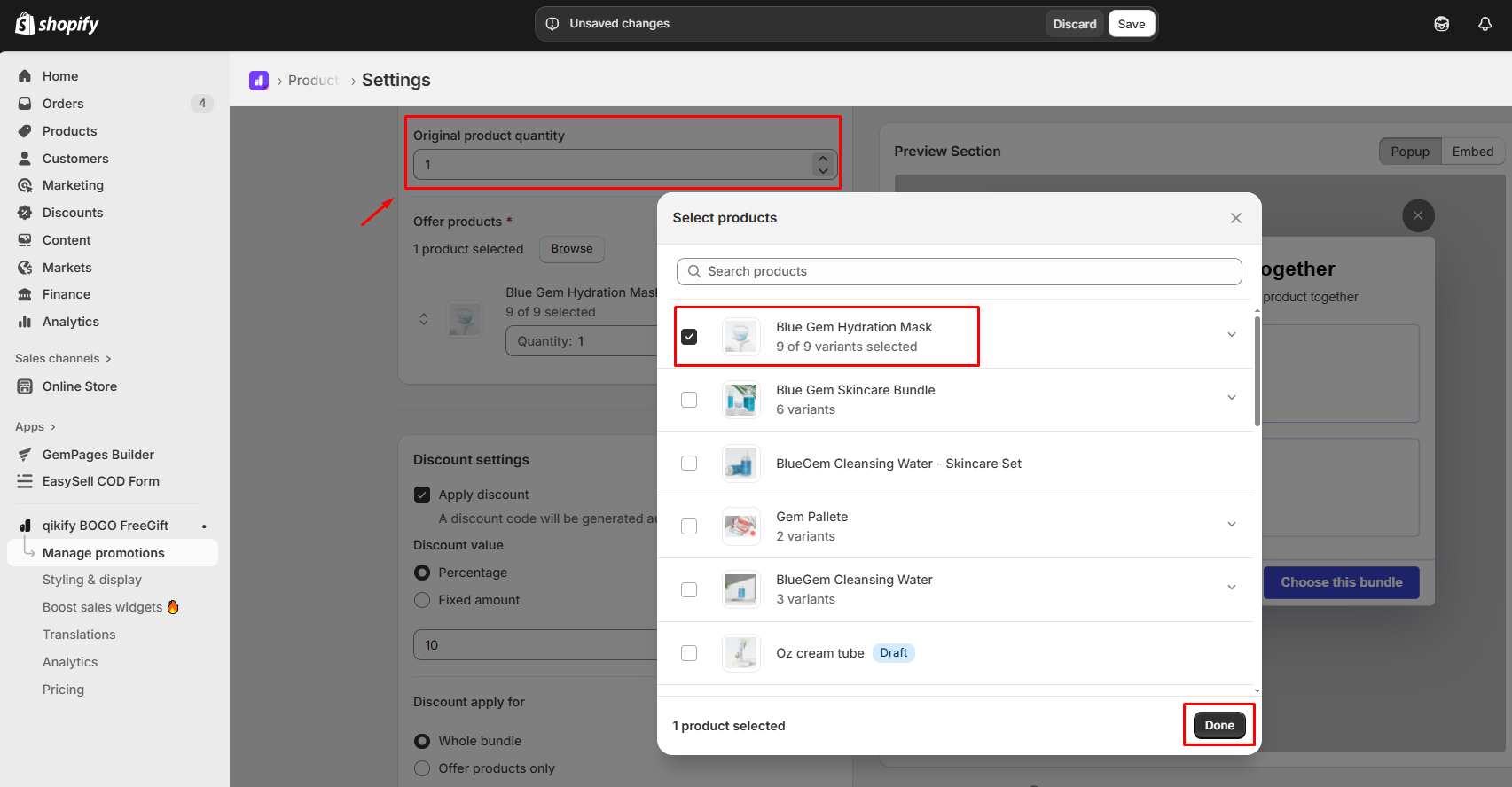 For example, select ‘Specific products’ to choose the particular items you want to trigger the offer popup, allowing for multiple selections.