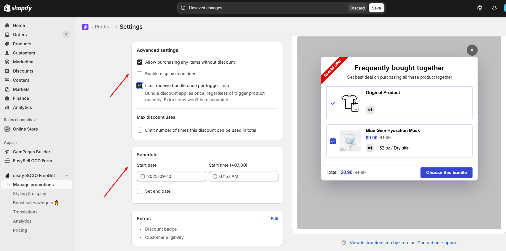 Under the Advanced settings & Schedule sections, fine-tune how your bundle works and set a start or end date for your offer. Tick the checkbox if you’d like to set an end date.