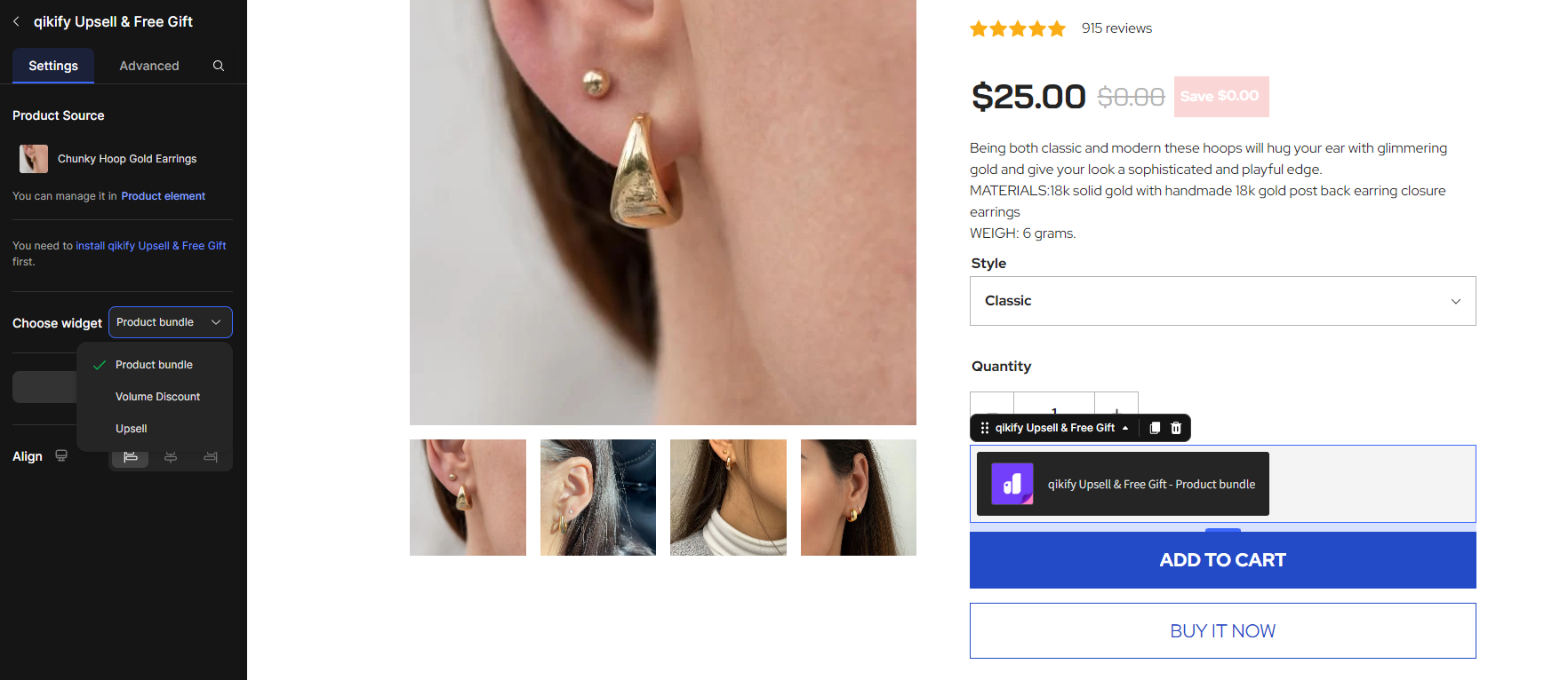 Qikify Upsell & Free Gift is designed to boost your revenue through various promotions such as cross-selling and bundling. This app enables one-click cart upsells, volume discounts, cross-selling through product bundles, buy-one-get-one offers, and more.