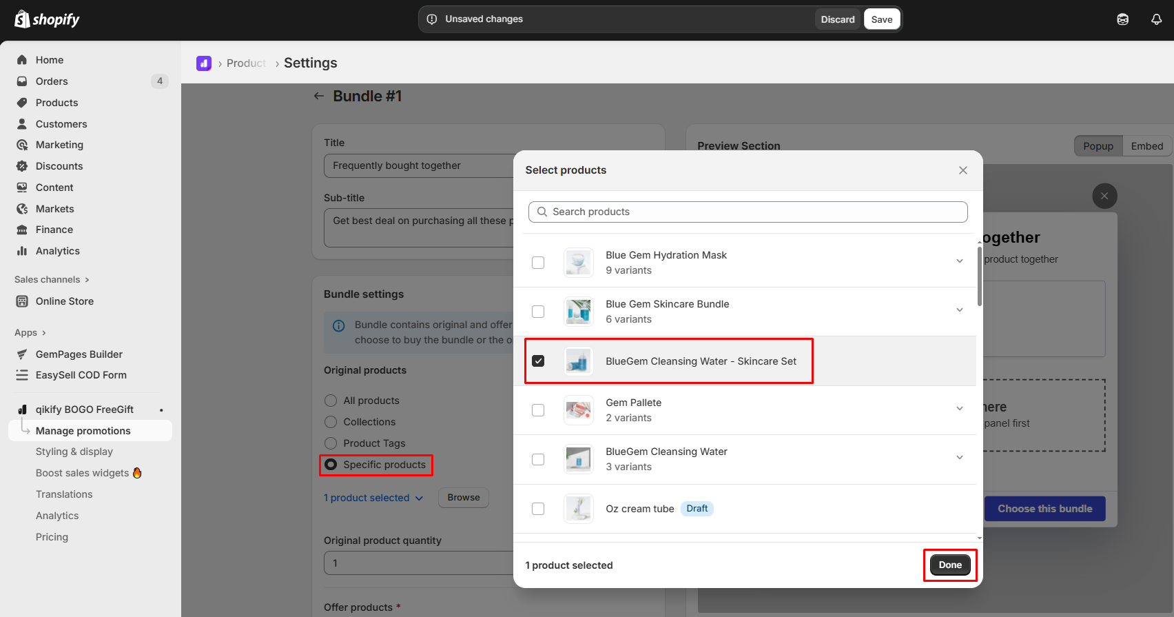 - Offer products: Select the product you want to include in your bundle. You can either search for it or browse through the list of available products. You’re welcome to choose more than one item.