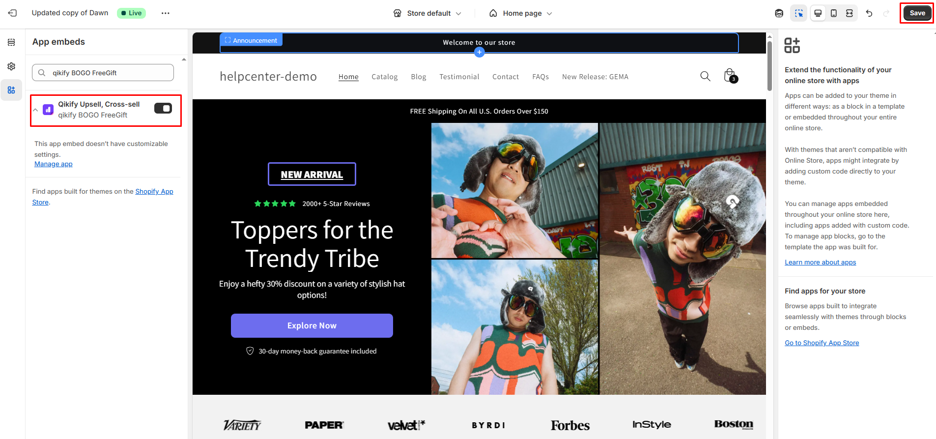 Step 3: Enable the Qikify BOGO & Auto Free Gifts app in the theme editor. Then, click Save before you leave.