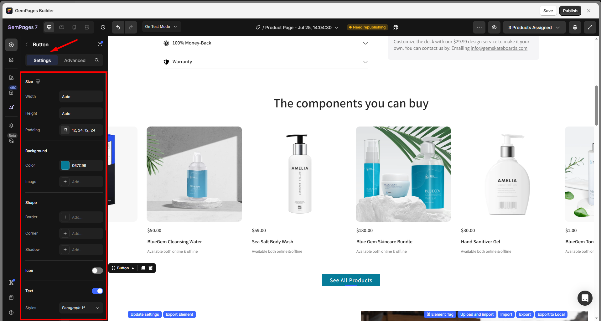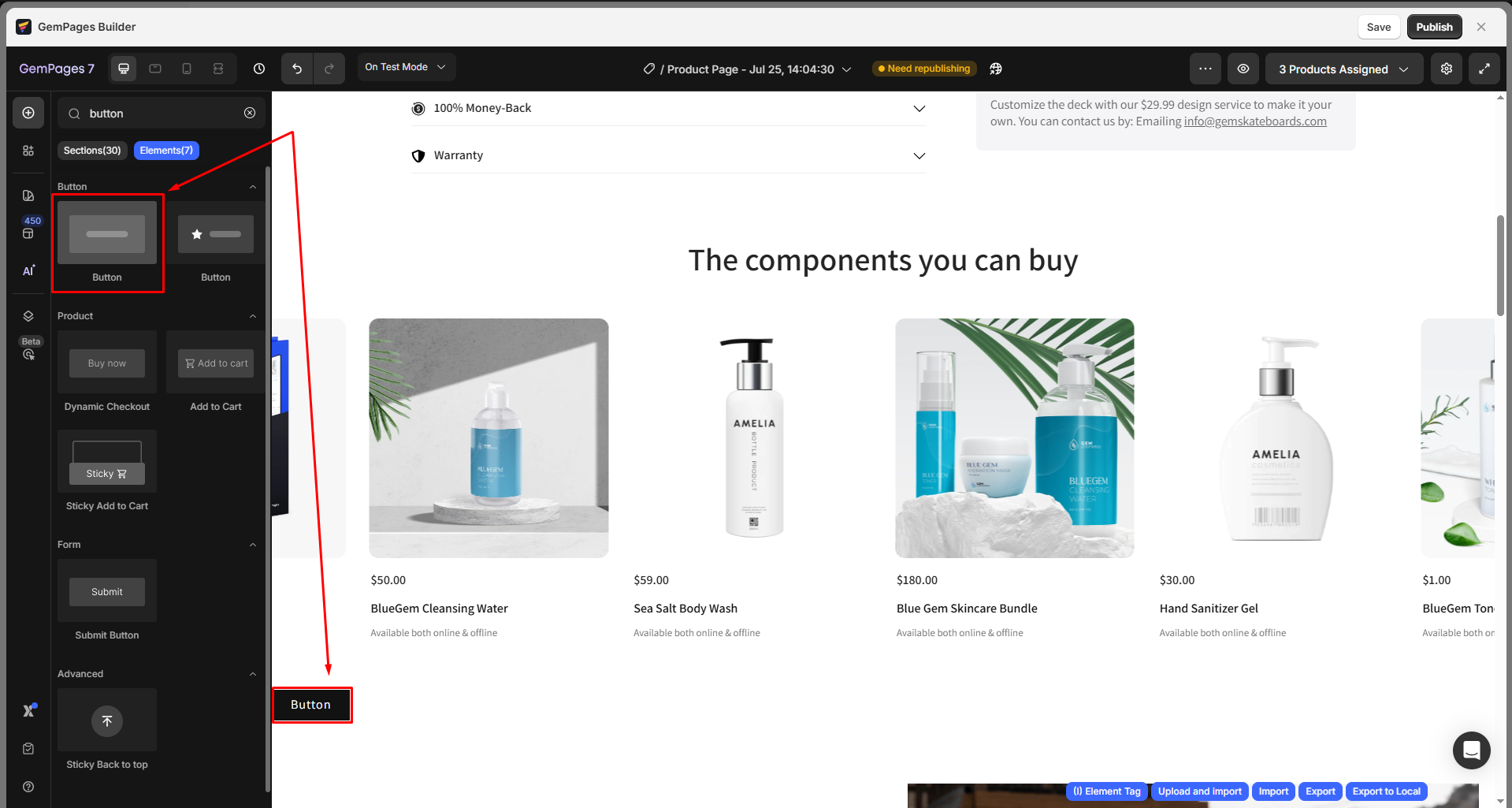 Step 1: Open a product page in the GemPages Editor v7. Use the search bar to find the Button Element and drop it into a Product Element.