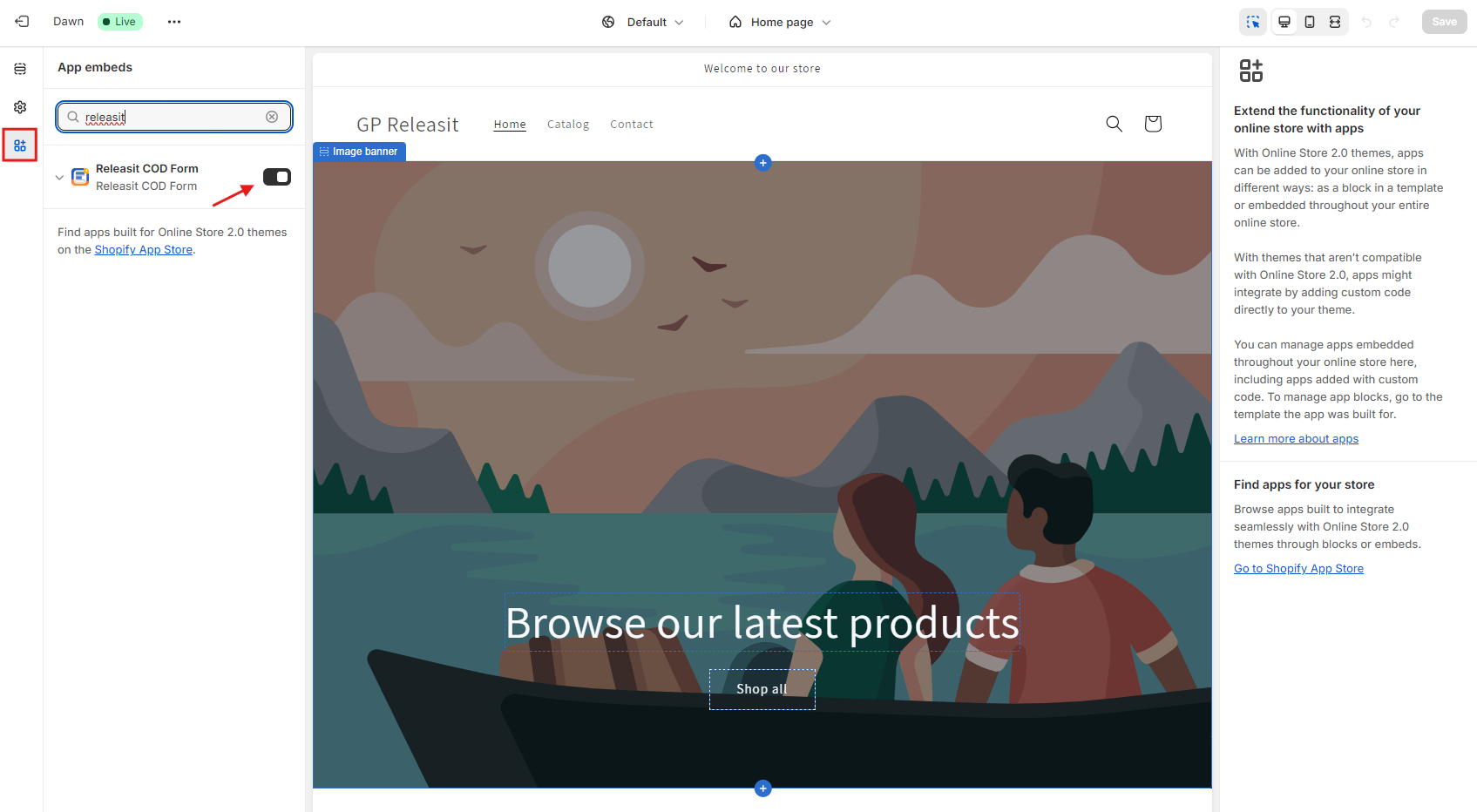 Step 4: Activate the app embed by clicking the turn-on button as shown below.