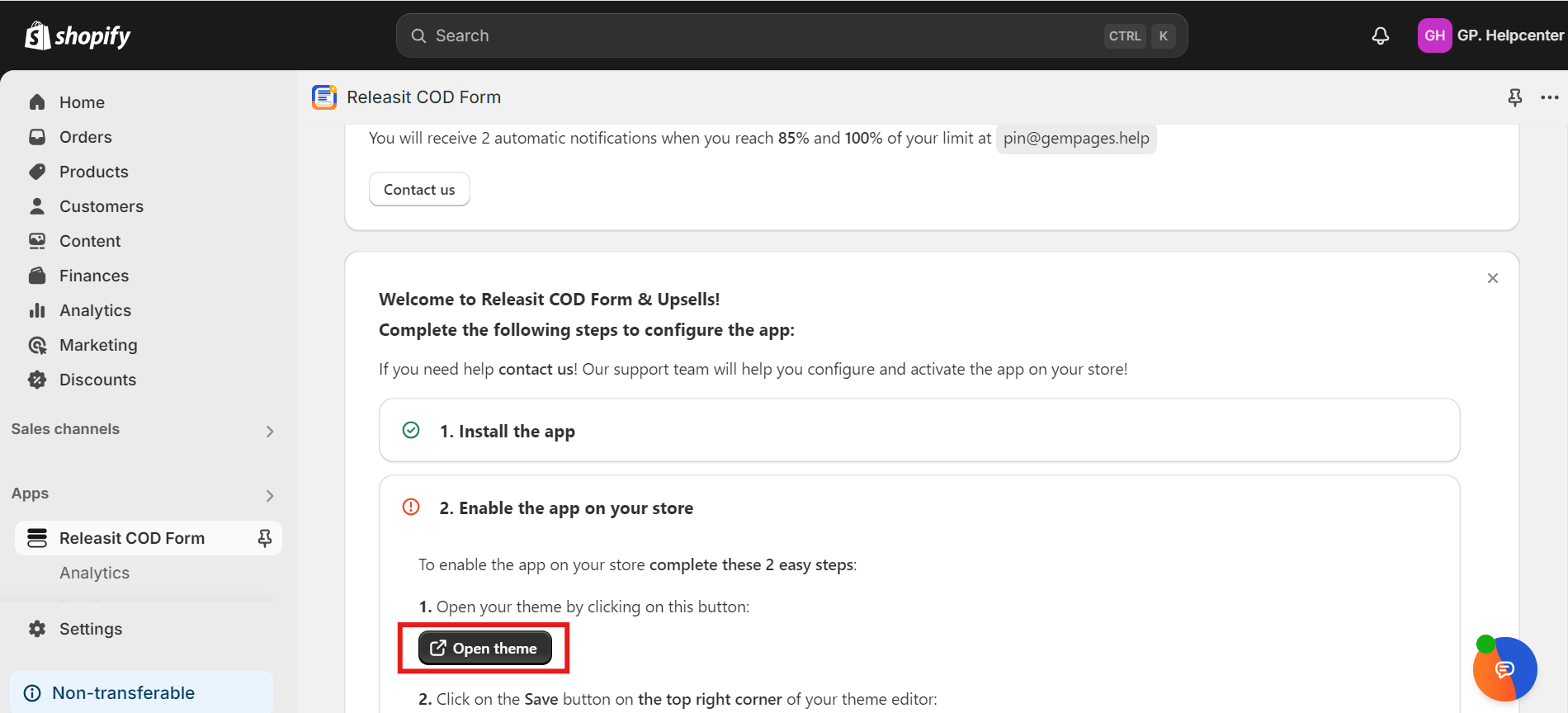 Step 3: Once you have successfully installed the app, click Open theme to enable the app on your store.