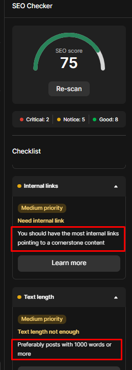 The average time for the SEO Checker feature to scan your page is 10 ➝ 15 seconds. When the scanning process is completed, the editor will show you a panel with three main areas: