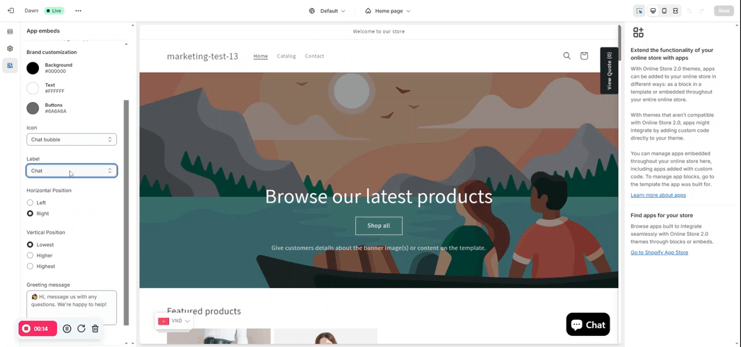 Step 2: Customize the online store editor’s online store editor’s chat color, position, and greeting message.