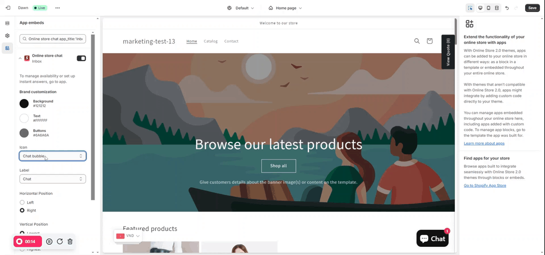 Step 1: Click “Set up chat,” open your theme, turn on the Shopify inbox app, and click “Save.”