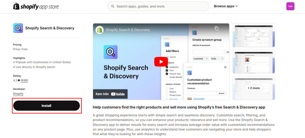 Step 1: Access the Shopify App Store and search for the ”Shopify Search & Discovery” app in the search bar.