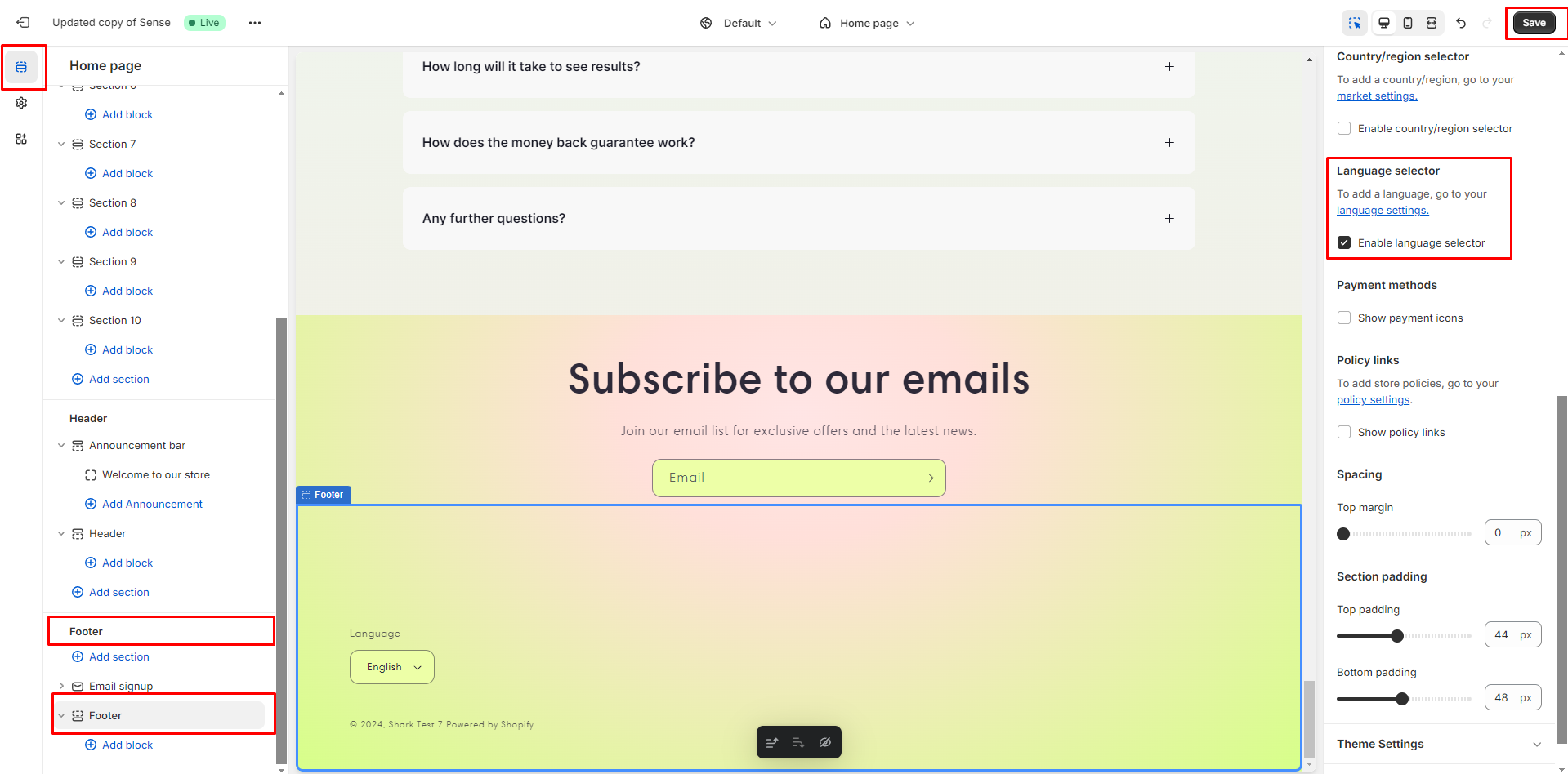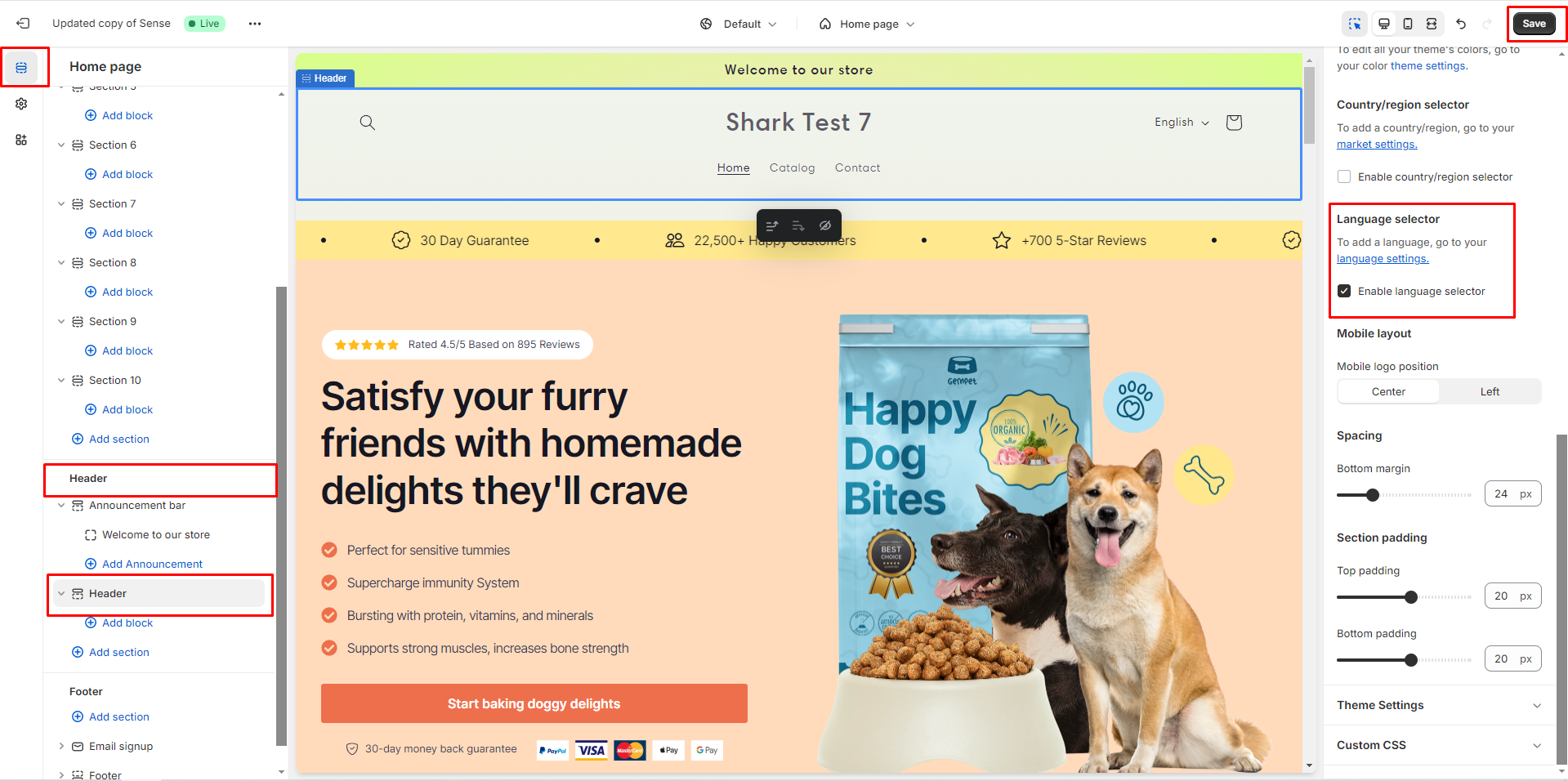 Step 5: Active the Language Selector on the Header or Footer while customizing your theme. Hit “Save” when finished.