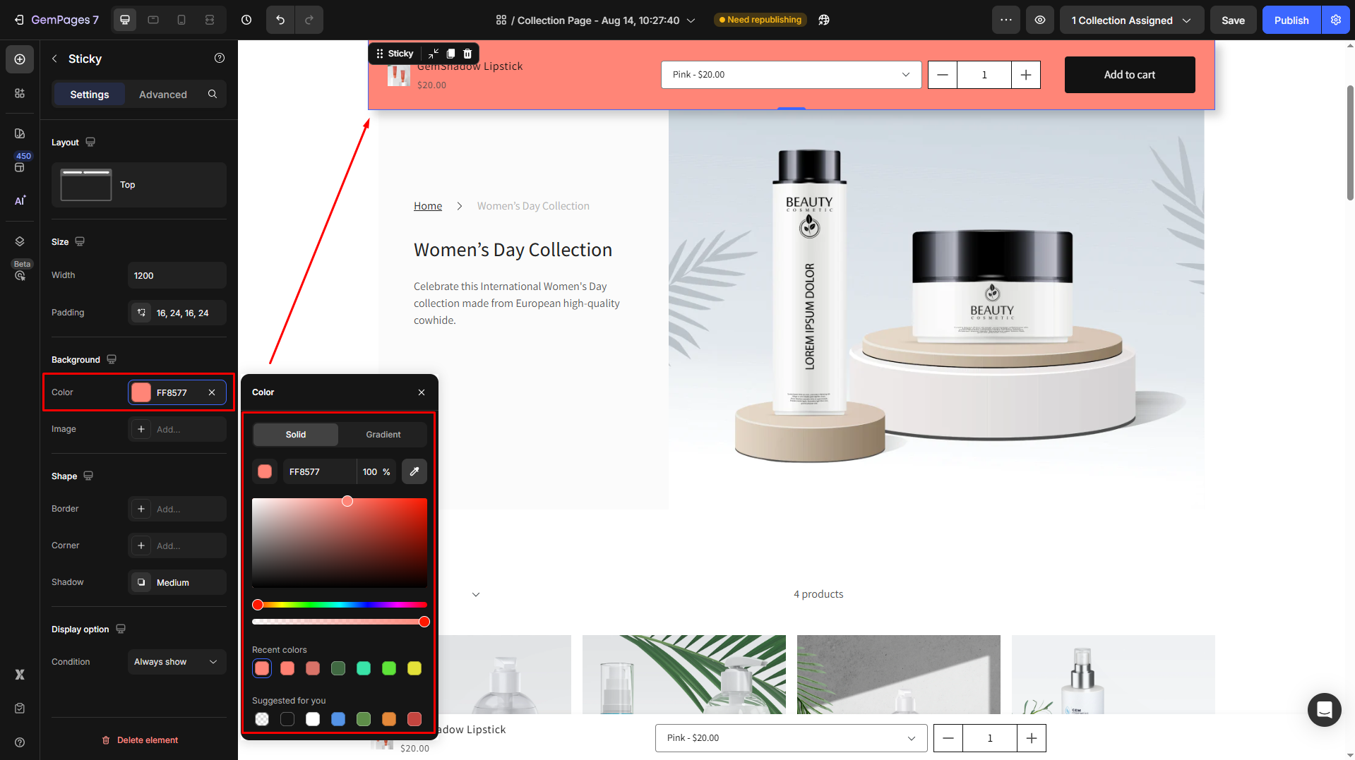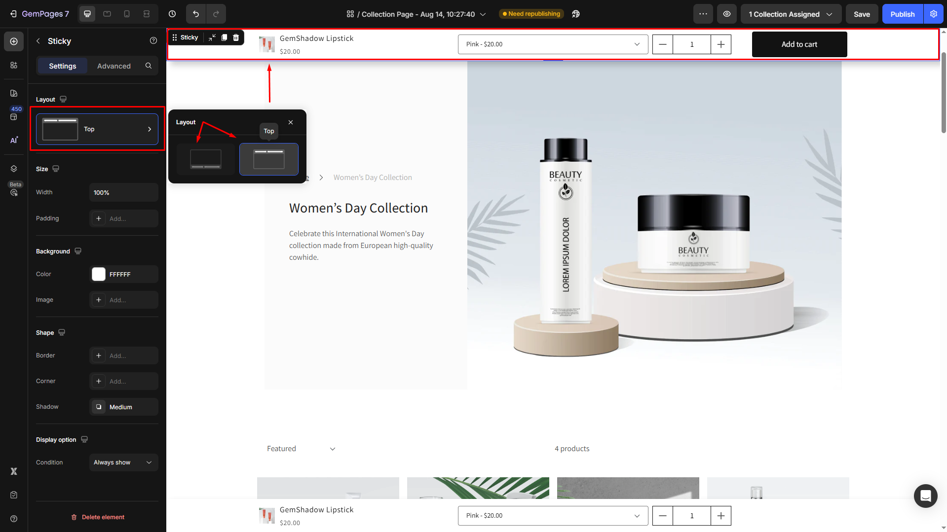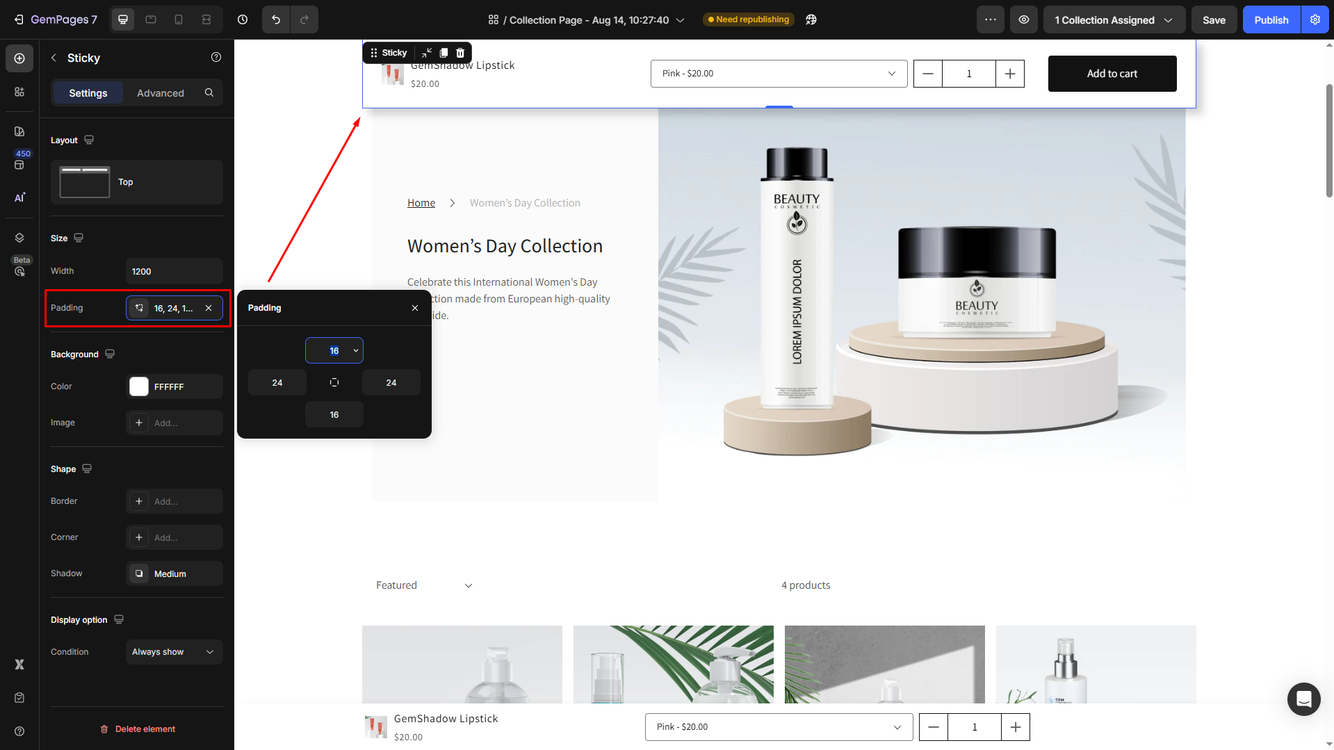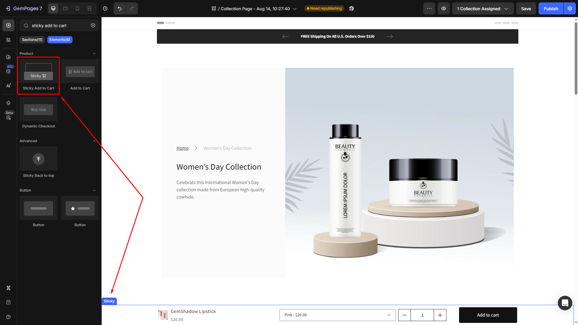 To incorporate a Sticky Add-to-Cart in GemPages Editor v7, please follow these steps: