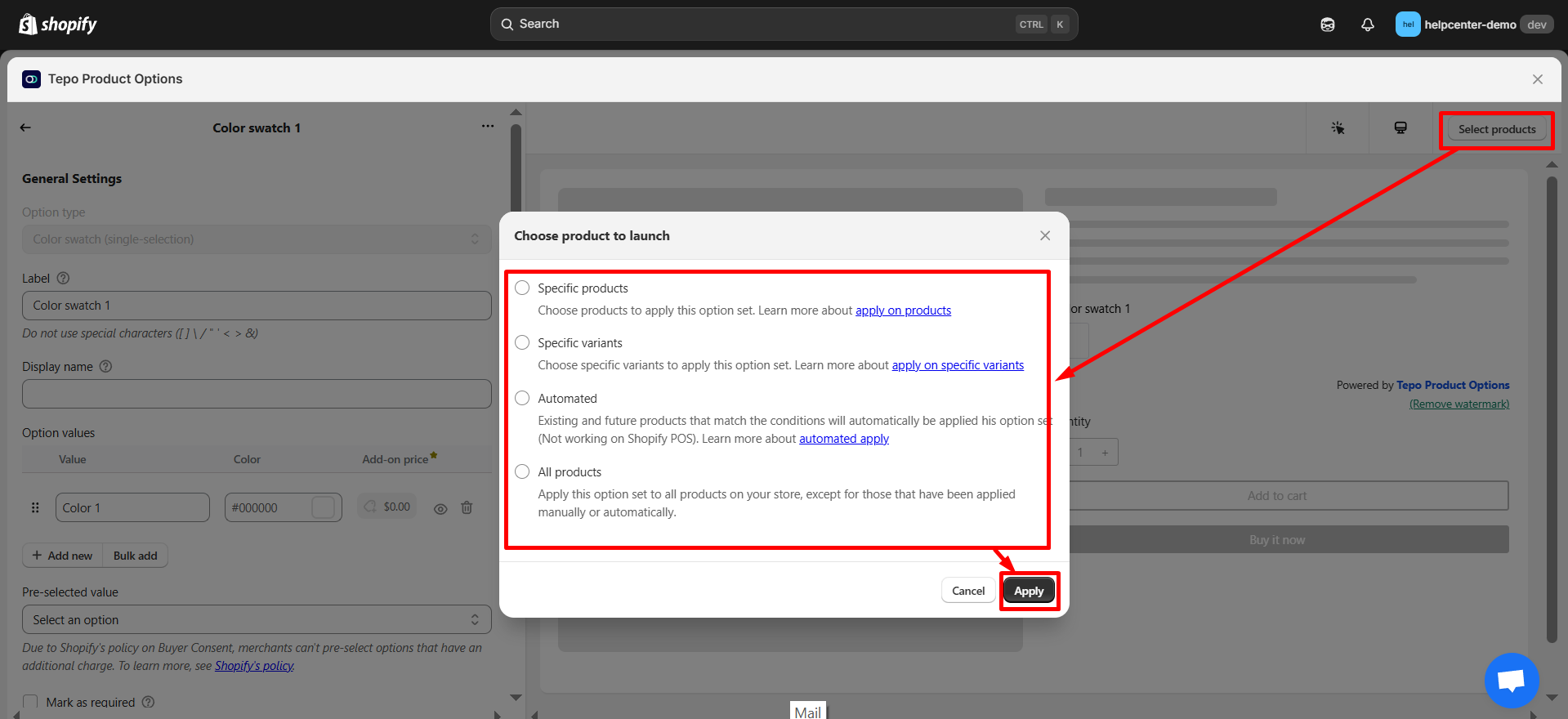 Step 5: After customizing the options, click on “Select product” and select a product or variant you want to apply the options to. Click “Apply” after choosing a product to save your changes.