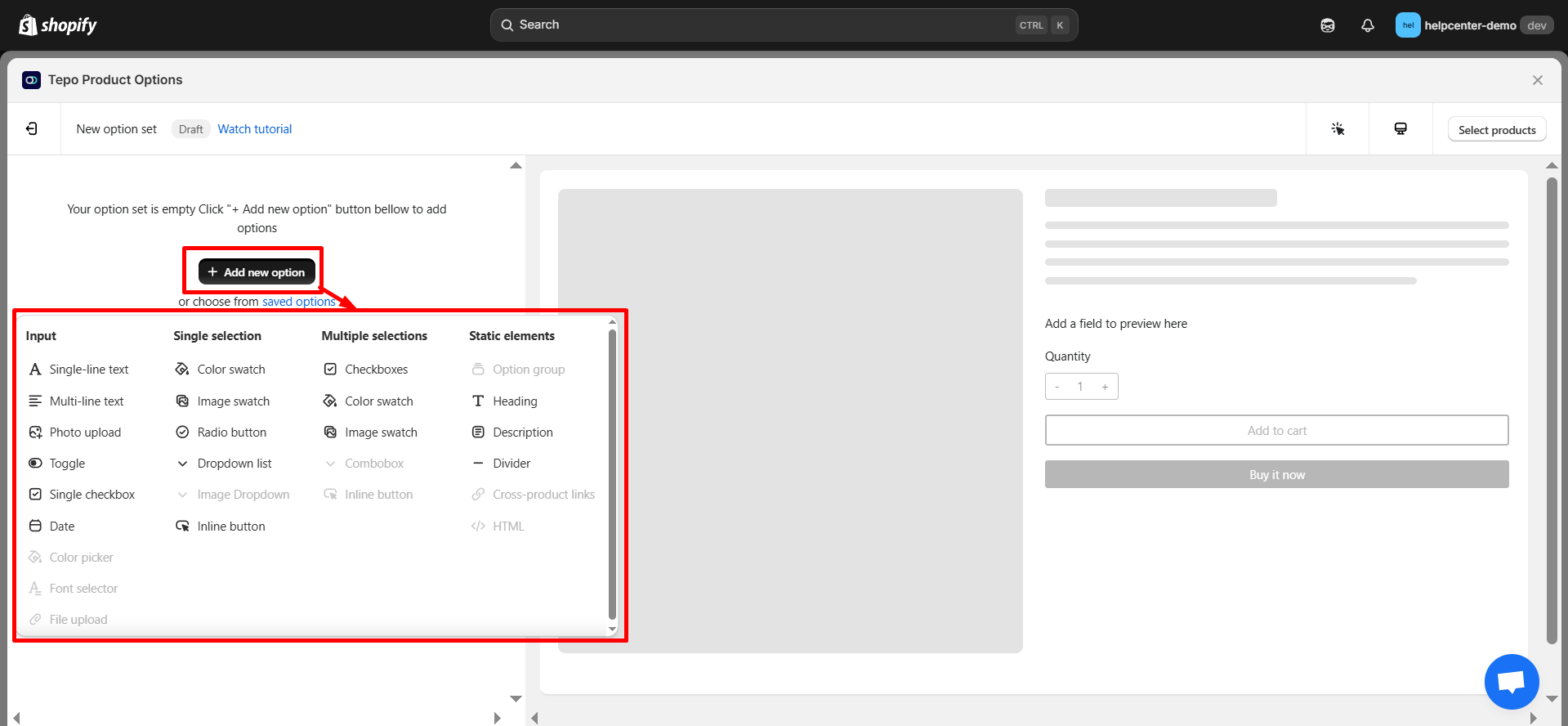 Step 4: Click the “Add new option” button to choose your favorite option type and customize it. You can preview the result on the right side of the screen.
