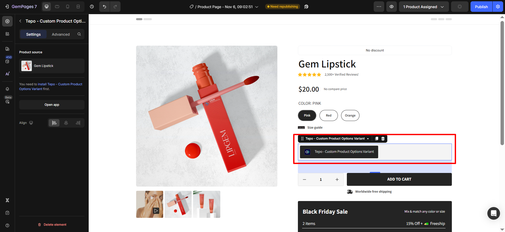 How to Add the Tepo Custom Product Options App Element to GemPages v7?