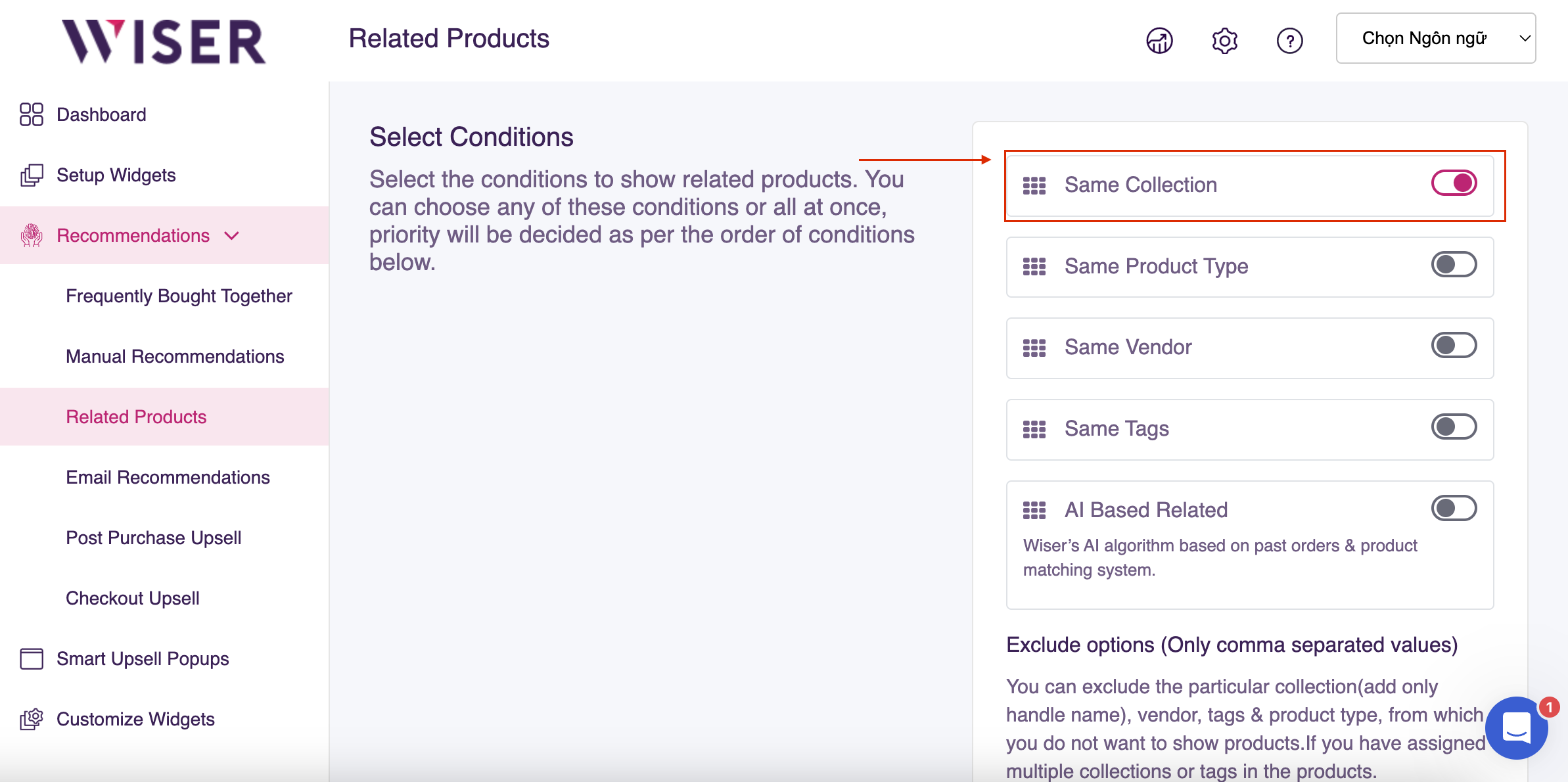 For instance, I select Same Collection. That means products from the same collection will be recommended together.