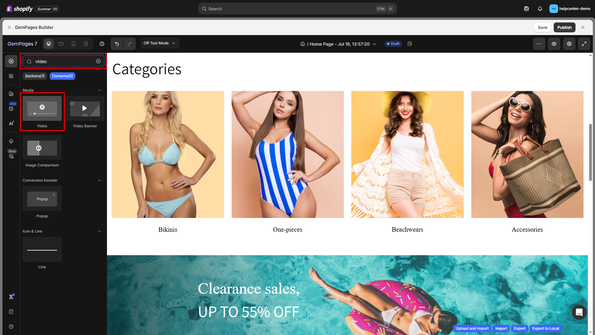 Step 1: Open the GemPages Editor and select a page to edit. Find the Video element on the left sidebar under the Media section, or use the search bar for quick access.